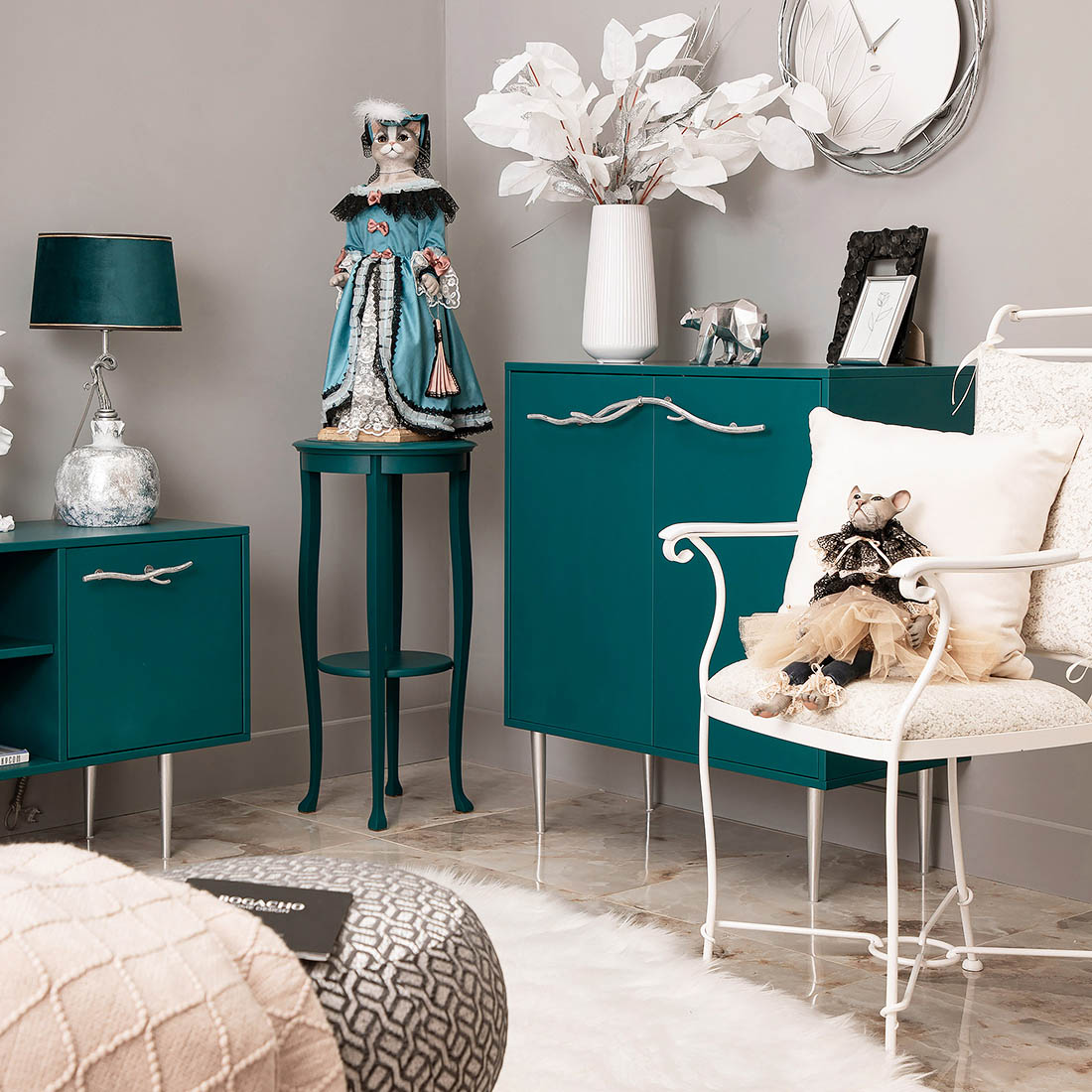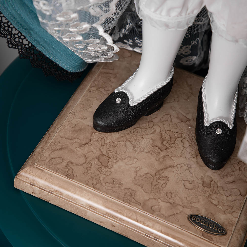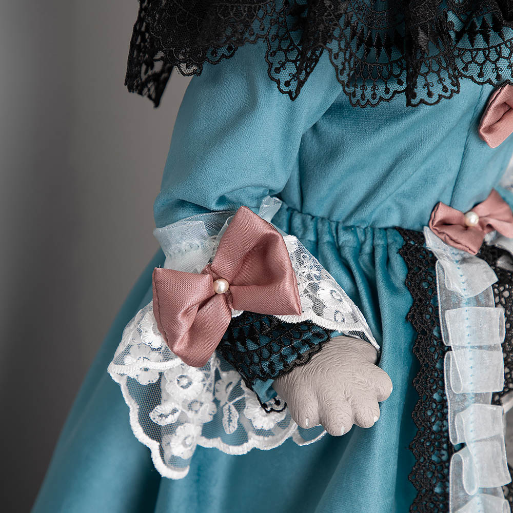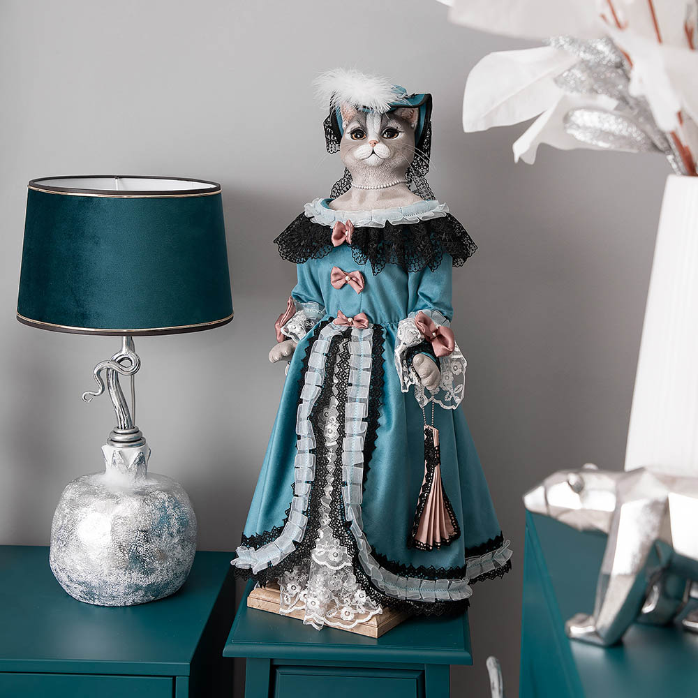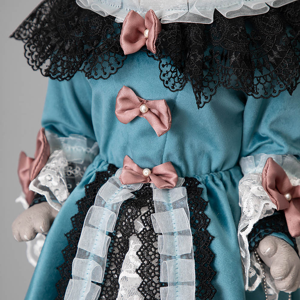 Коллекционная кукла Кошка Элеонора выполнена на основе металлокаркаса, что обеспечивает изделию стойкость. Для придания кукле формы используются синтепон. Голова, руки и ноги изготавливаются из высококачественного коелгинского мрамора, который привозится в виде мраморной крошки, затем отливается в формы и раскрашивается акриловыми красками вручную. При пошиве костюмов используются европейские ткани, кружево.