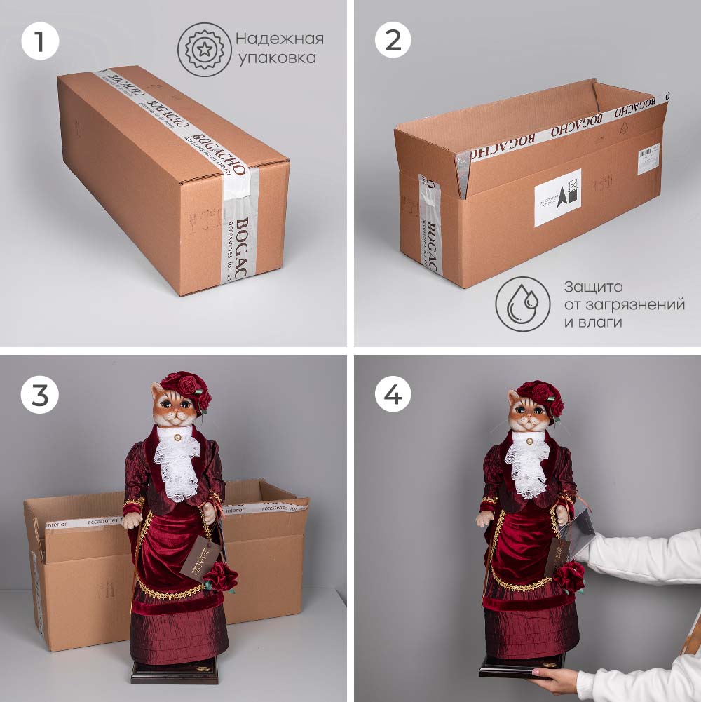 Материалы изготовления и размеры изделияКукла выполнена на основе металлокаркаса, что обеспечивает изделию стойкость. Для придания кукле формы используют синтепон. Голова, руки и ноги изготавливаются из высококачественного коелгинского мрамора, который привозится в виде мраморной крошки, затем отливается в формы и раскрашивается акриловыми красками вручную. При пошиве костюмов используются Европейские ткани.