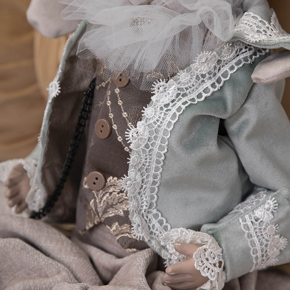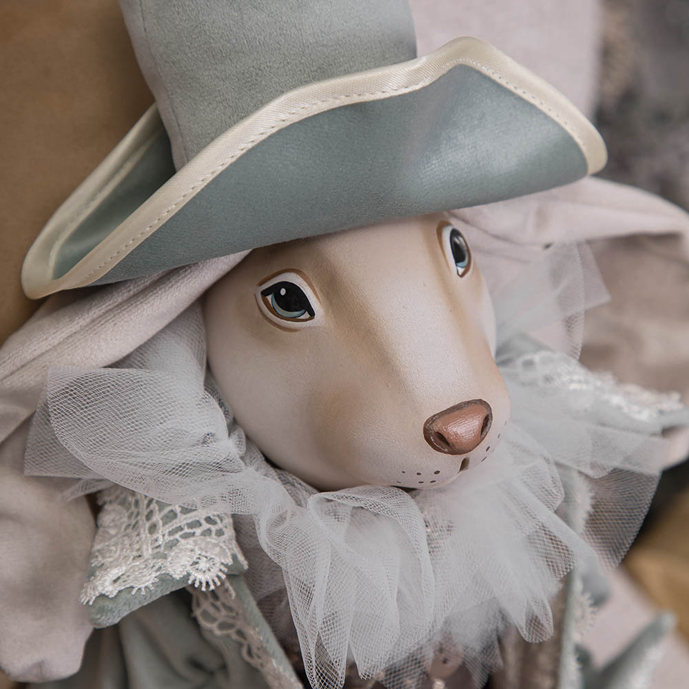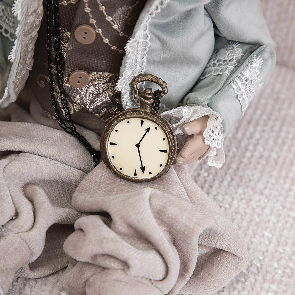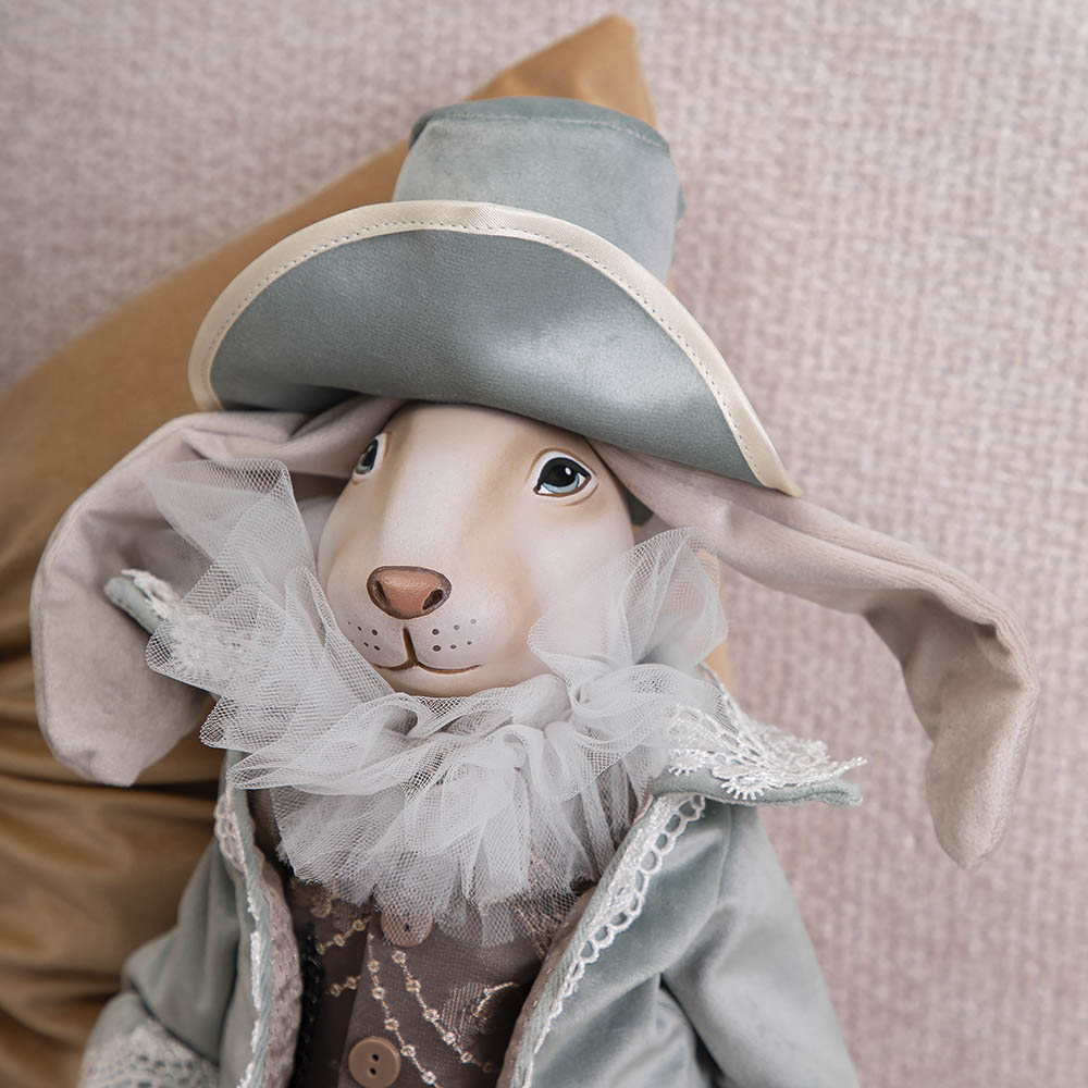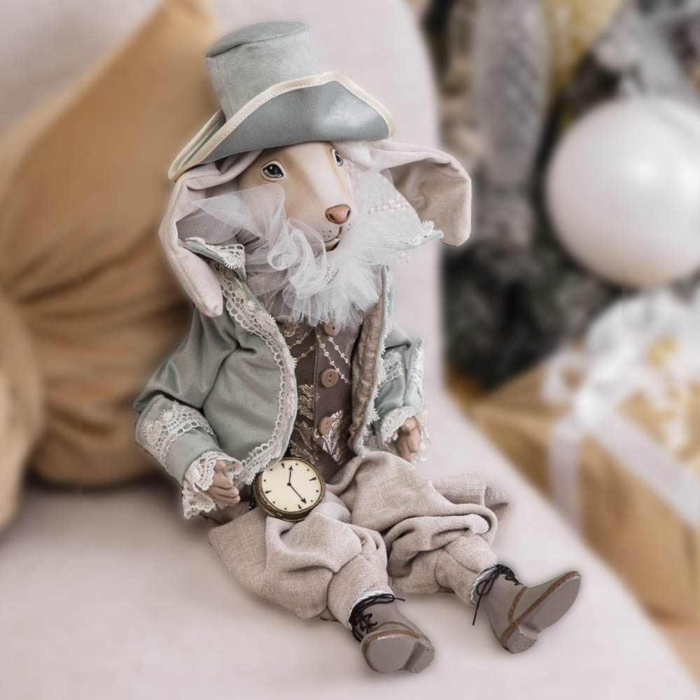 Мистер ЭгльСобиратель сказок Эгль стал прототипом нашей коллекционной куклы. Доброта, загадочность, открытость и ум – качества, вдохновившие мастеров и дизайнеров BOGACHO на создание кролика Эгля по образу знаменитого литературного героя.У Мистера Эгля бескаркасные мягкие ноги, поэтому его можно посадить на столик или полку. Голова и лапки отлиты из мрамора, в руках и тканевых ушках находится проволока. Тело сделано из стрейчевой ткани и холофайбера. Хвостик – искусственный мех.Элегантный костюм включает в себя множество деталей и отлично проработан: шляпа из вельвета, украшенная атласной лентой, жаккардовые брюки и жилет, фатиновый воротничок, вельветовый пиджак с утонченным французским кружевом и аккуратные мраморные часы, расписанные акрилом вручную. Металлическая брошь с затейливыми узорами украшает воротник.Для создания эффекта «натуральной слезы» при росписи глаз мастера используют специальный акриловый даммарный лак, который увеличивает блеск, переливы и свечение.