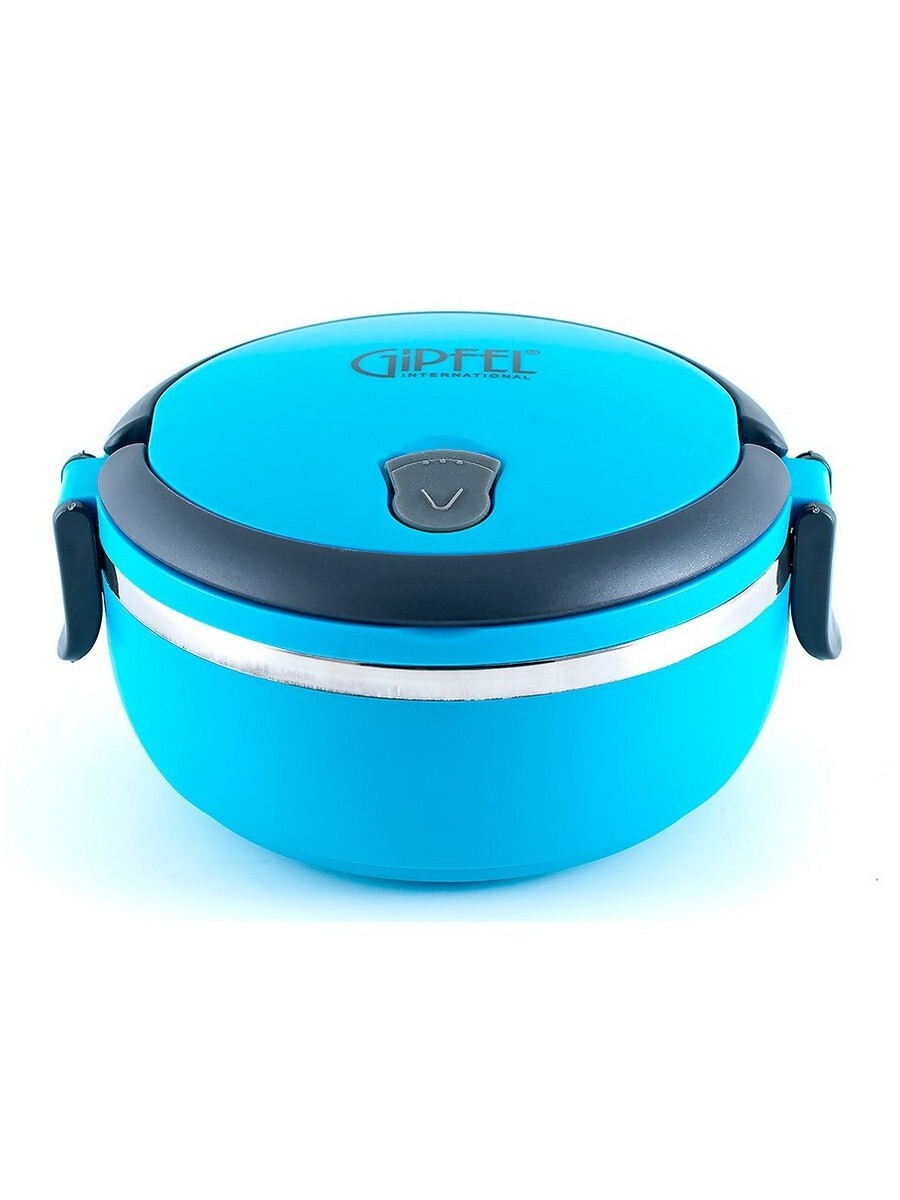 Ланч-бокс Gipfel 0285. Круглый контейнер имеет объем 600мл. На крышке складывающаяся ручка, по бокам надежные фиксаторы. Контейнер подойдет для переноски вторых блюд и бутербродов. Сделан из нержавеющей стали и пластика синего цвета. Размер: 17x16x9 см.
