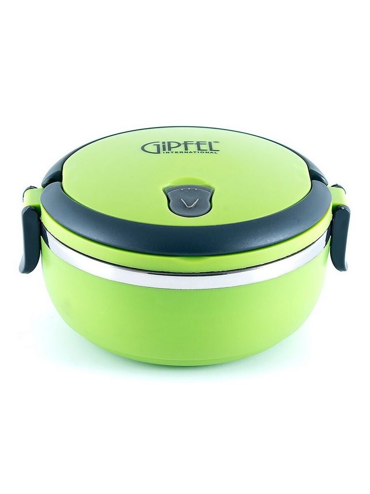 Ланч-бокс Gipfel 0286. Круглый контейнер имеет объем 600мл. На крышке складывающаяся ручка, по бокам надежные фиксаторы. Контейнер подойдет для переноски вторых блюд и бутербродов. Сделан из нержавеющей стали и пластика зеленого цвета. Размер: 17x16x9 см.
