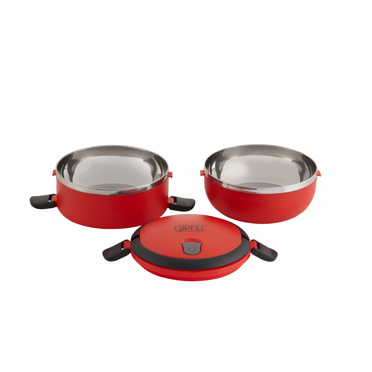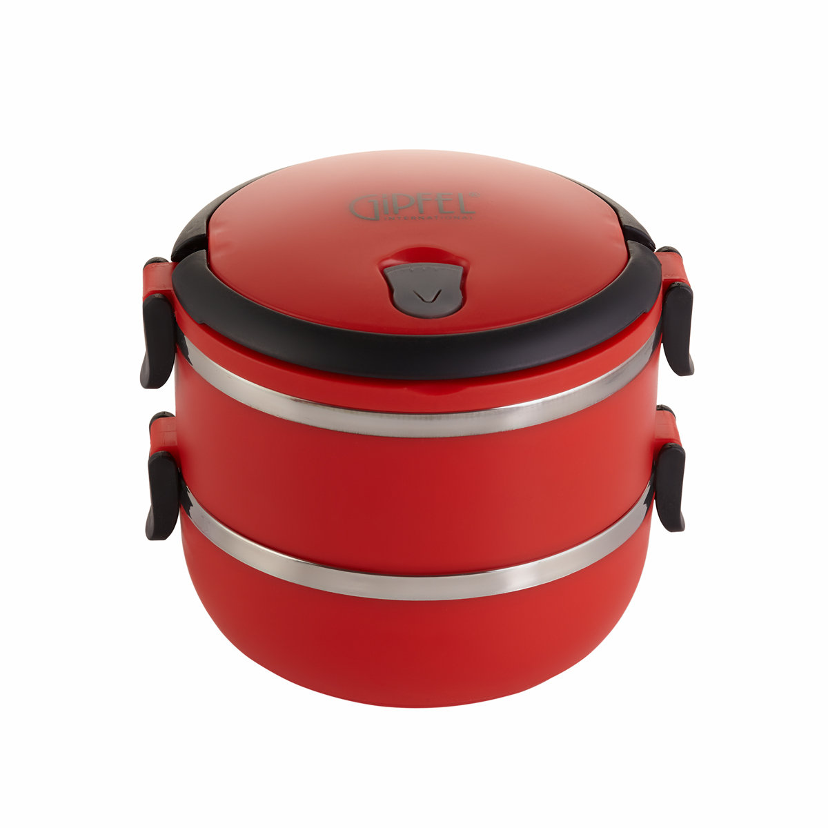 Ланч-бокс круглый Gipfel 4133. Ланч-бокс состоит из двух контейнеров по 600 мл. На крышке складывающаяся ручка. Контейнер подойдет для переноски второго блюда и бутербродов. Сделан из нержавеющей стали и пластика.