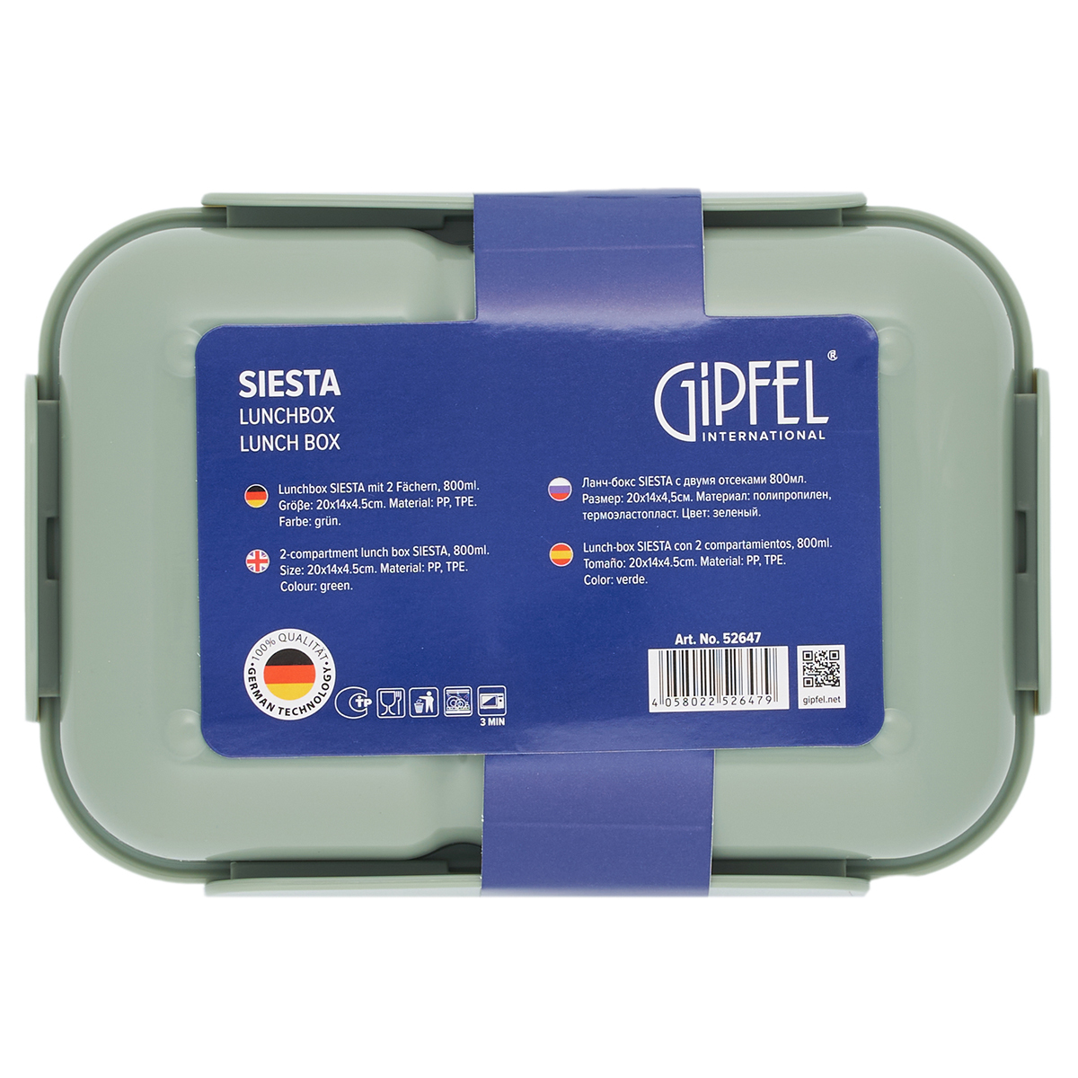 Ланч-бокс Gipfel Siesta с двумя отсеками 52647 800 мл. Объем рабочий в каждой секции: 270 мл и 400 мл. Размер: 20х14х4,5 см. Материал: полипропилен, термоэластопласт.