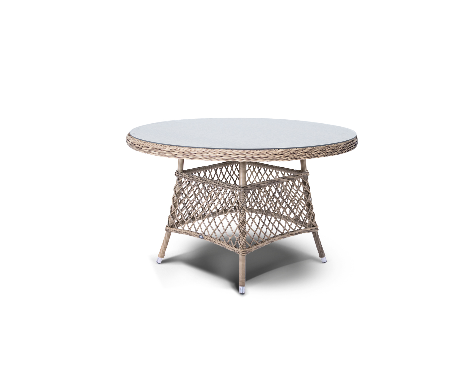 Алюминиевый каркас, круглый искусственный ротанг соломенного цвета, ручное плетение. Кресла оснащены подушками со съёмными чехлами.