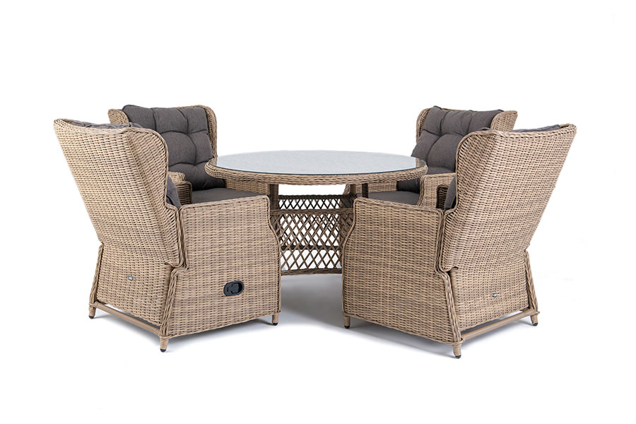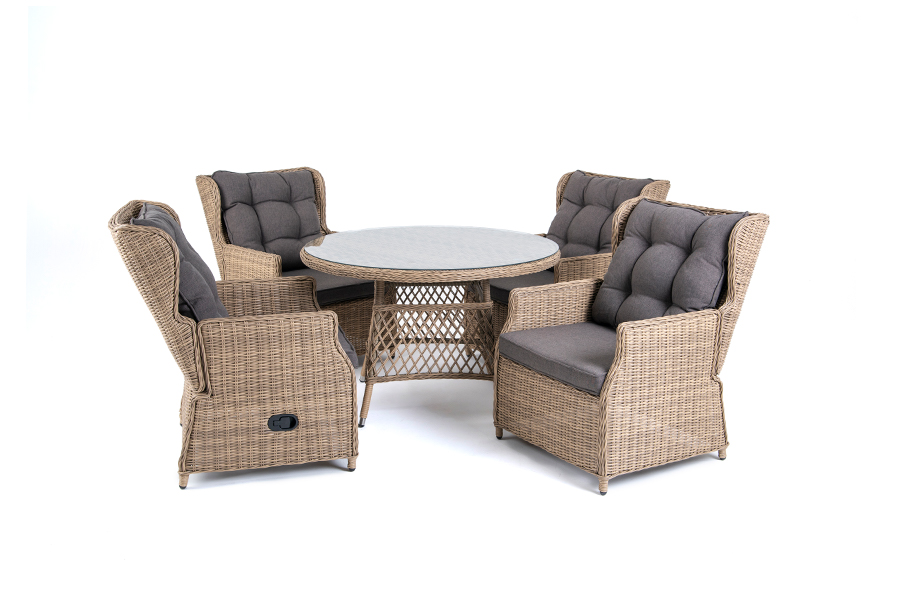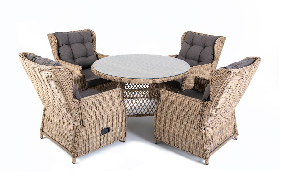 Обеденная группа из искусственного ротанга: 4 раскладывающихся кресла и обеденный стол со стеклянной столешницей.