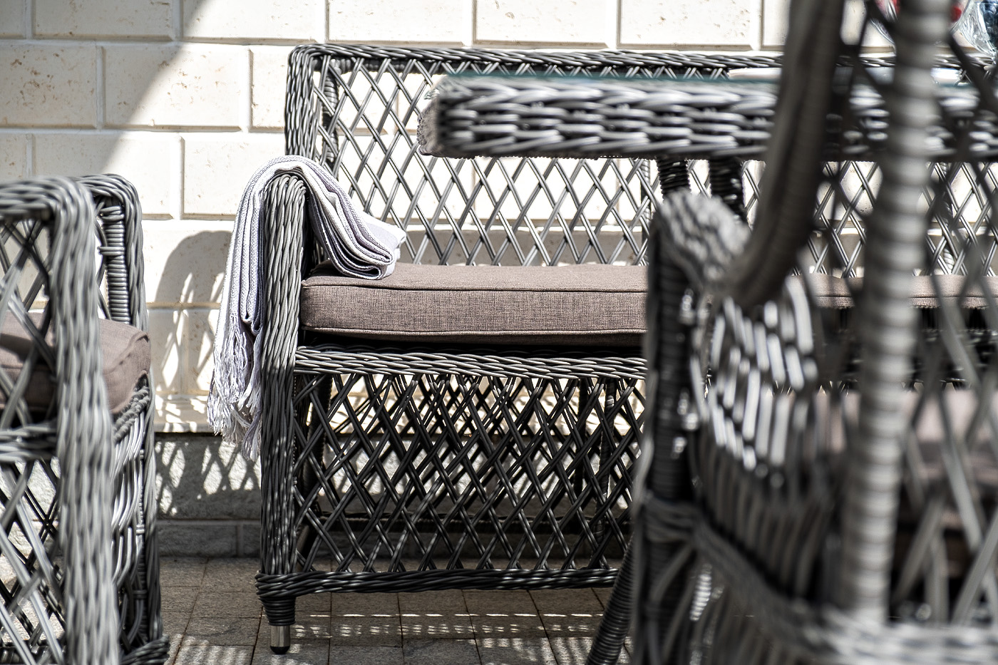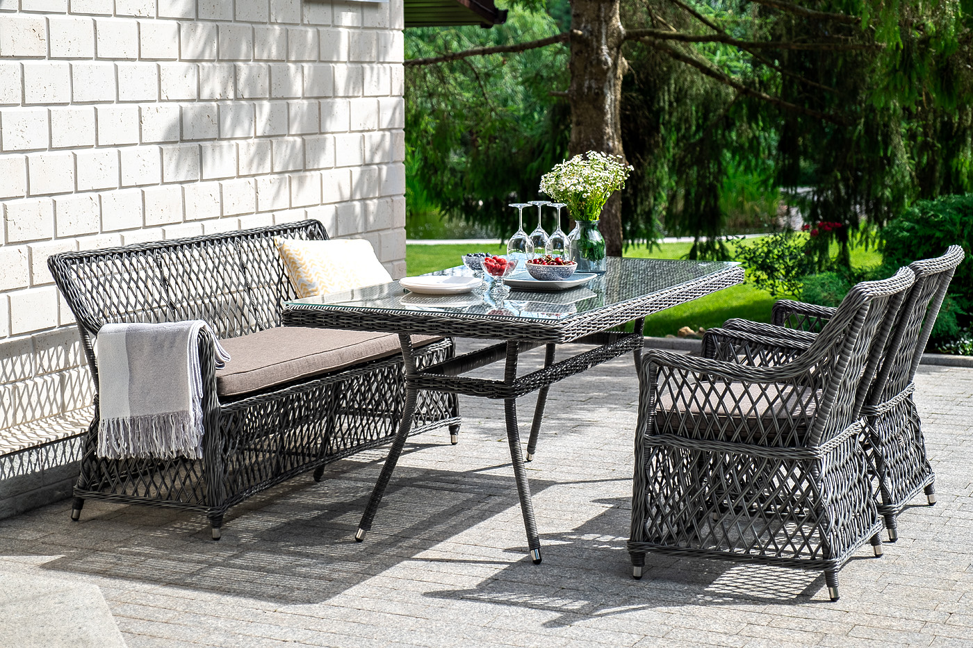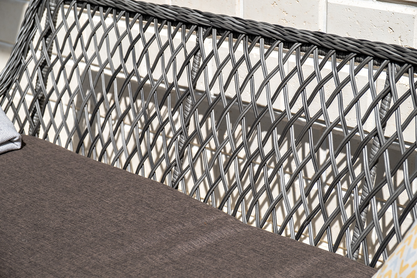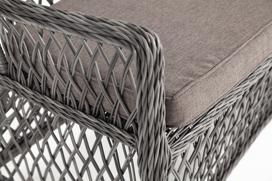 Каркас выполнен из алюминия, выдерживающий до 200 кг. Сверху все вручную оплетено круглым искусственным ротангом высокого качества. Цвет - "графит". Под солнечным светом изящное плетение приобретает более насыщенный тон.