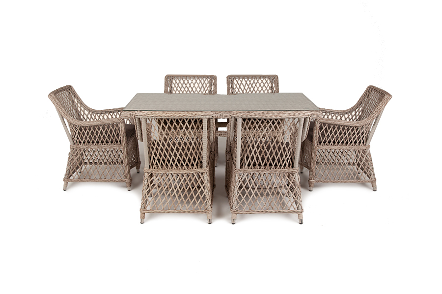 Набор состоит из прямоугольного стола со стеклянной столешницей, размером 1600×900×750 мм и 6 кресел, размером - 550×660×850 мм.