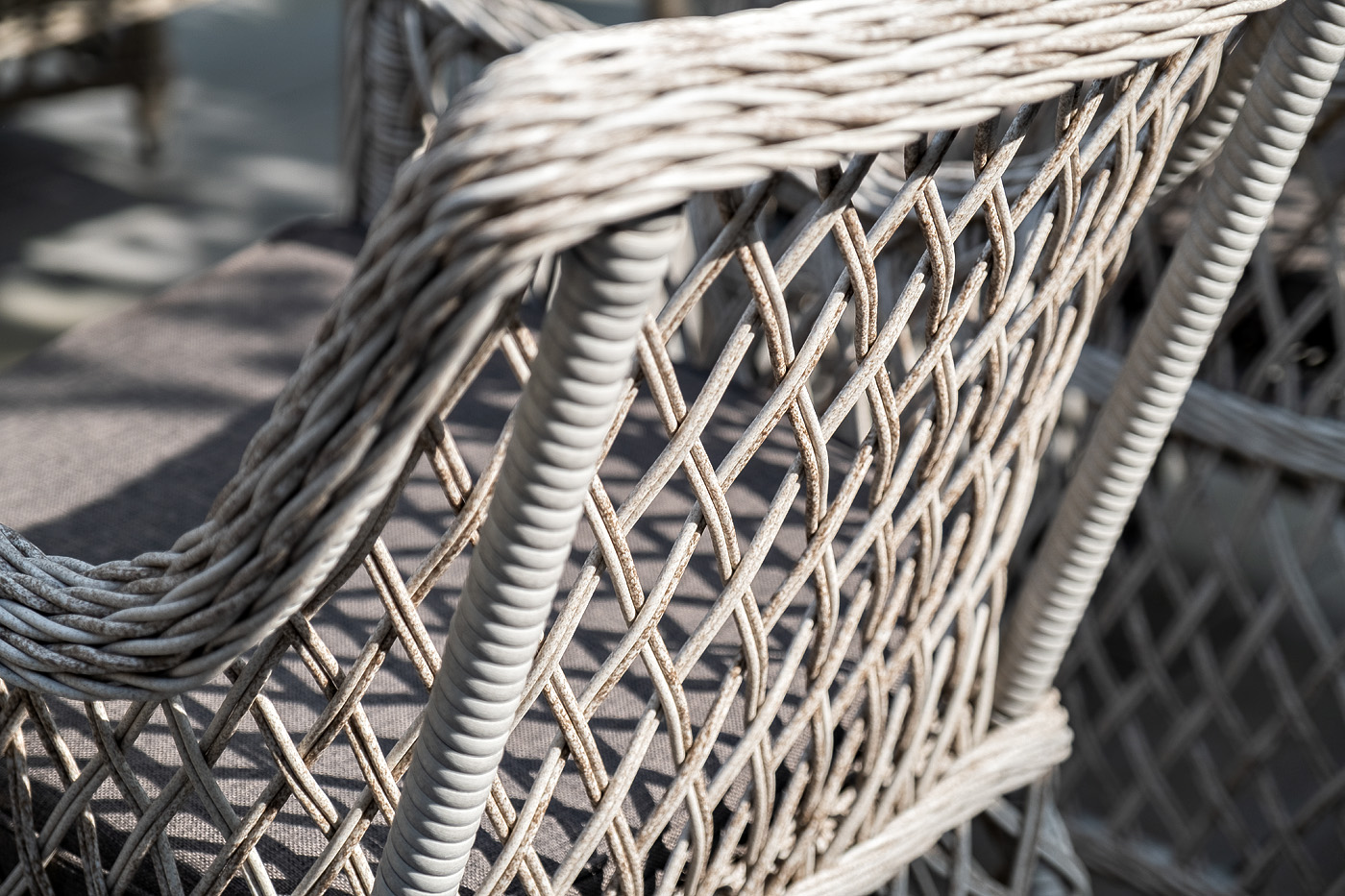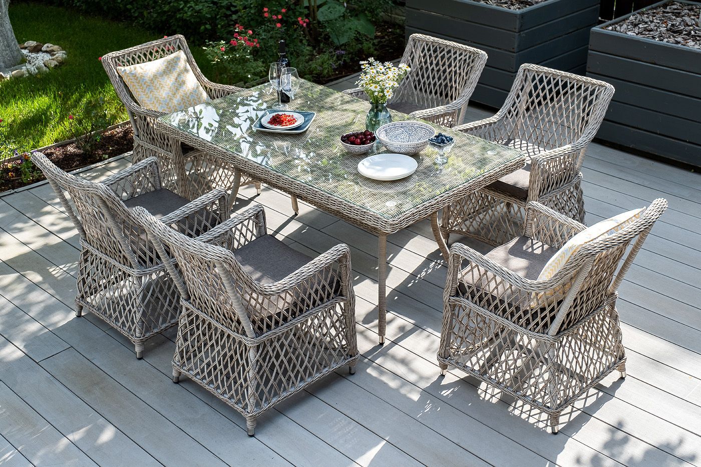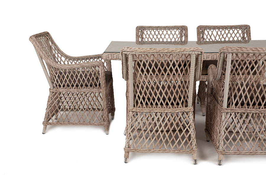 Комплект гармонично сочетает в себе алюминий, из которого выполнен каркас и декор из искусственного ротанга бежевого оттенка. Прекрасным дополнением мебели стали мягкие подушки из всепогодной ткани со съёмными чехлами.