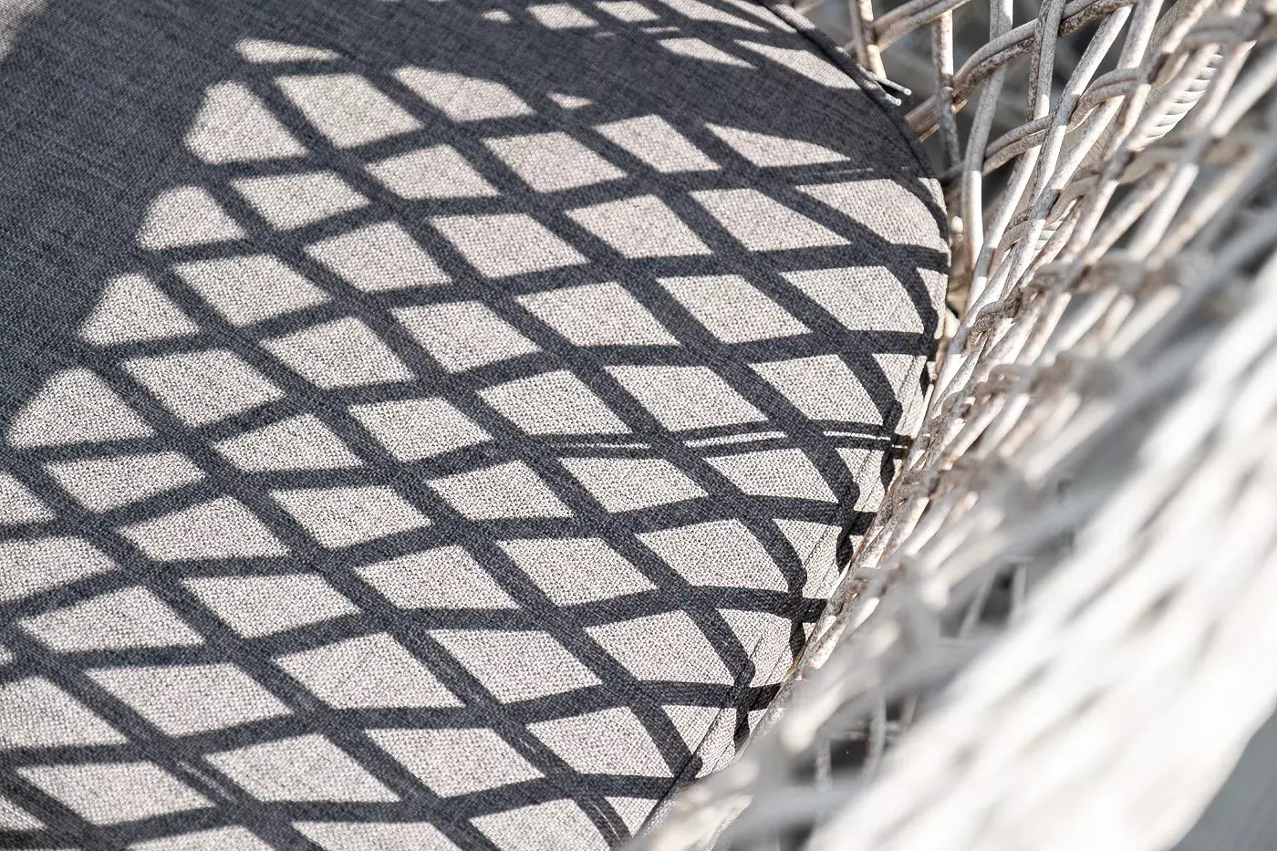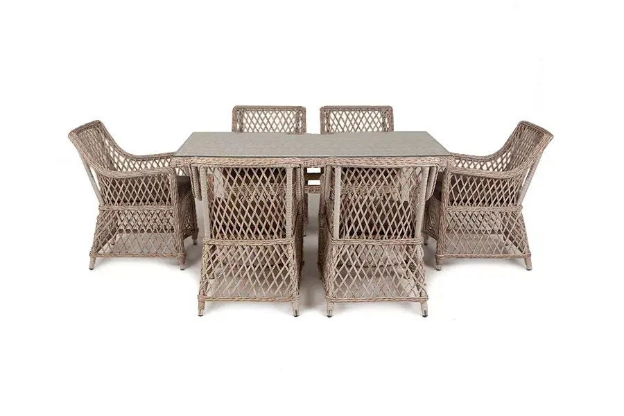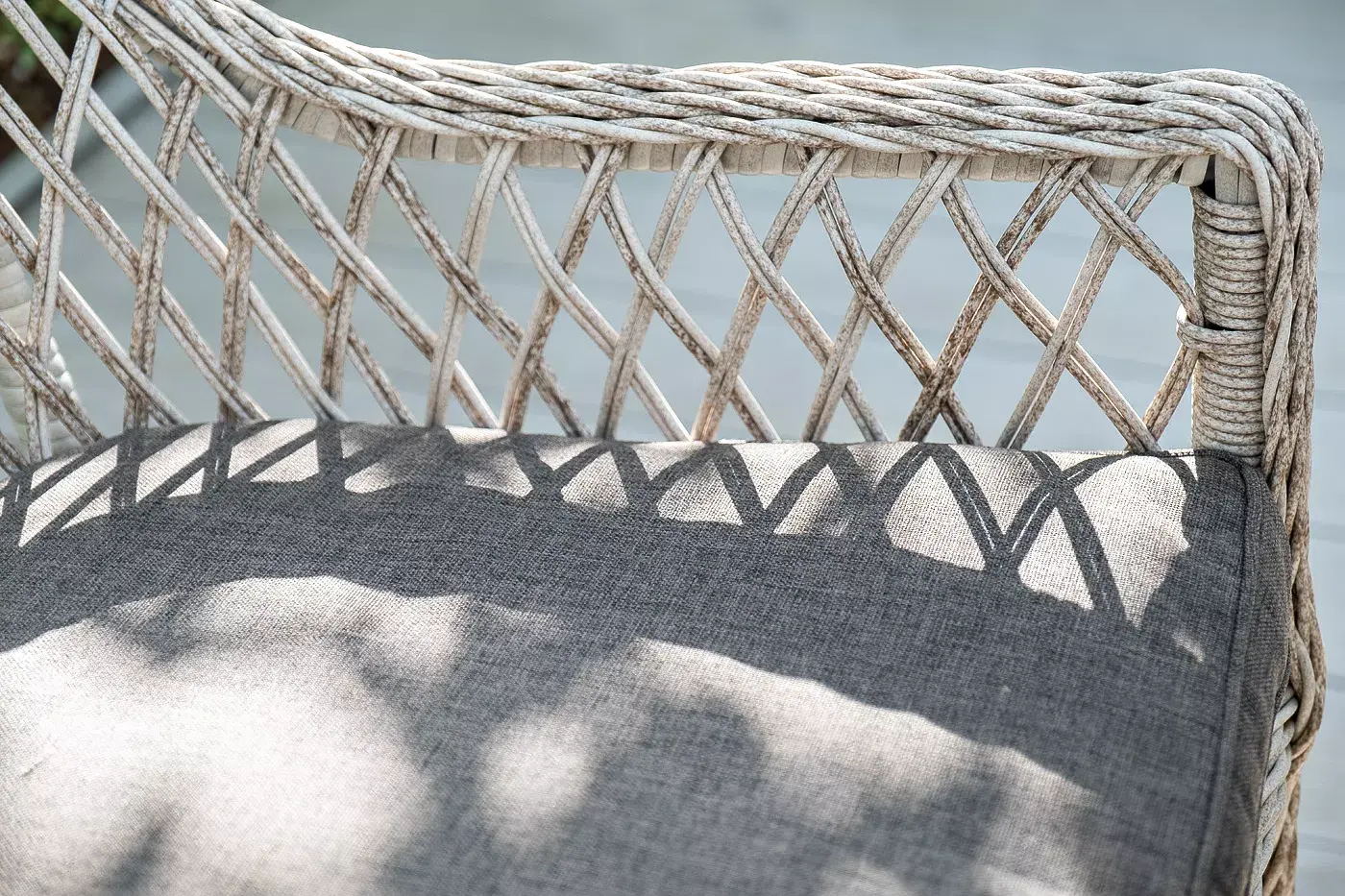 Комплект гармонично сочетает в себе алюминий, из которого выполнен каркас и декор из искусственного ротанга бежевого оттенка. Прекрасным дополнением мебели стали мягкие подушки из всепогодной ткани со съёмными чехлами.