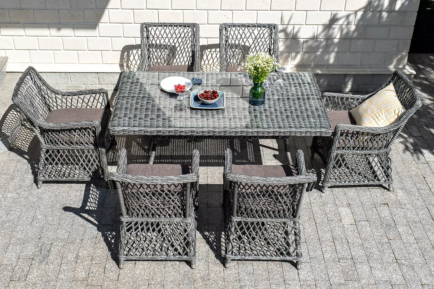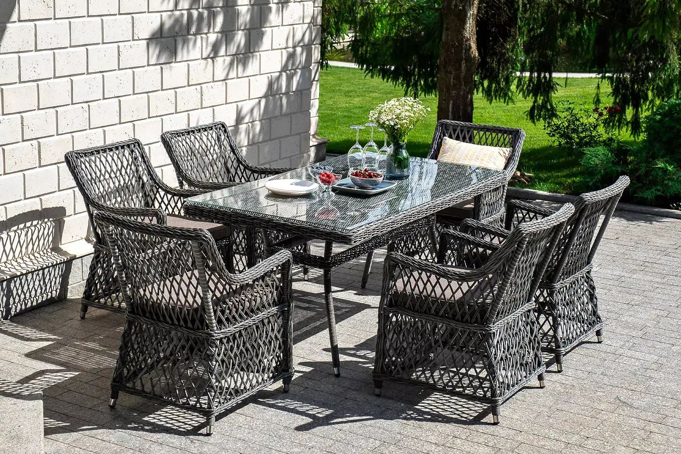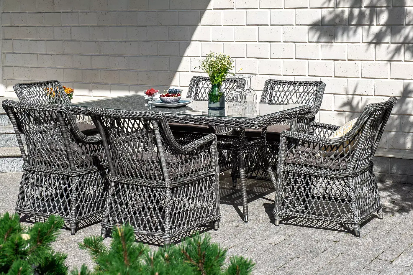 Обеденный комплект «Латте» в графитовом оттенке выполнен из искусственного ротанга и алюминиевого каркаса.