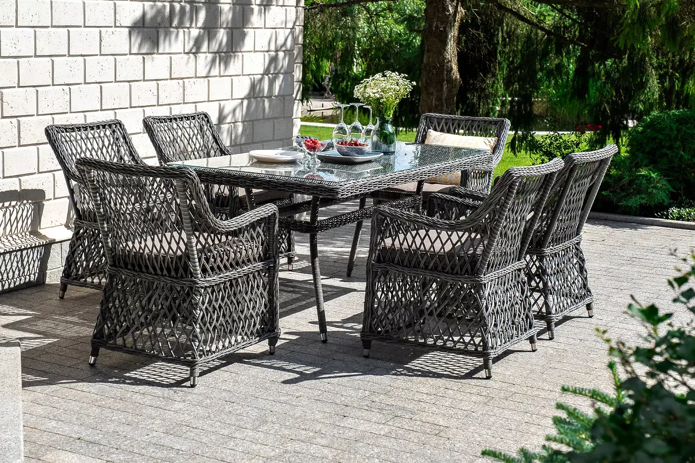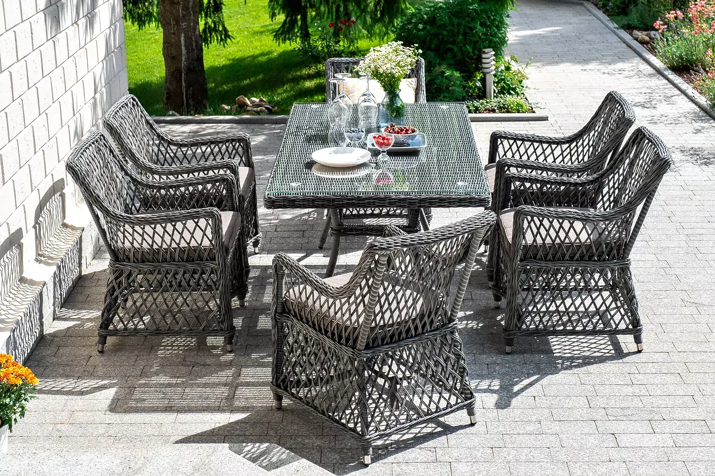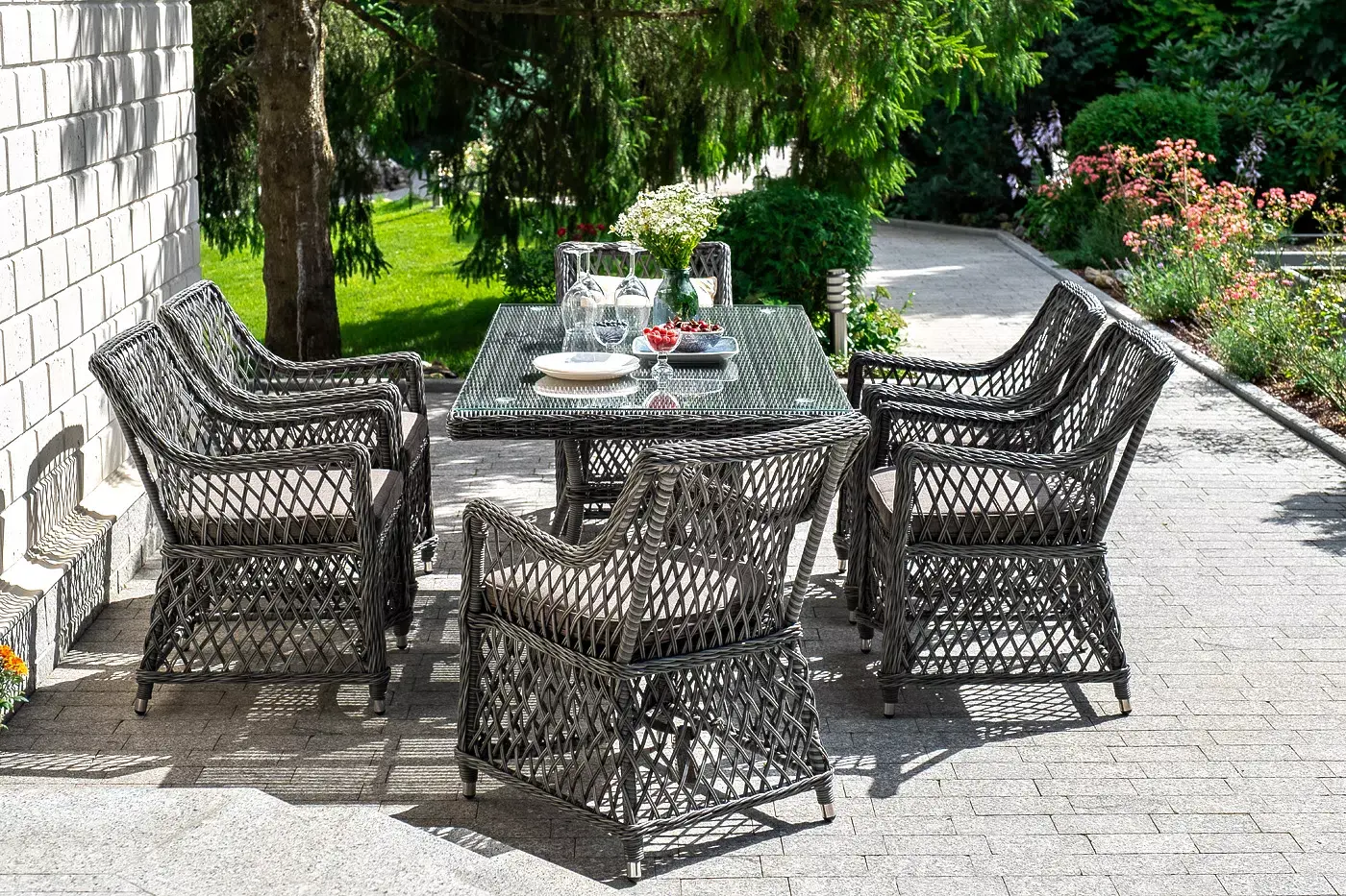 Обеденный комплект «Латте» в графитовом оттенке выполнен из искусственного ротанга и алюминиевого каркаса.