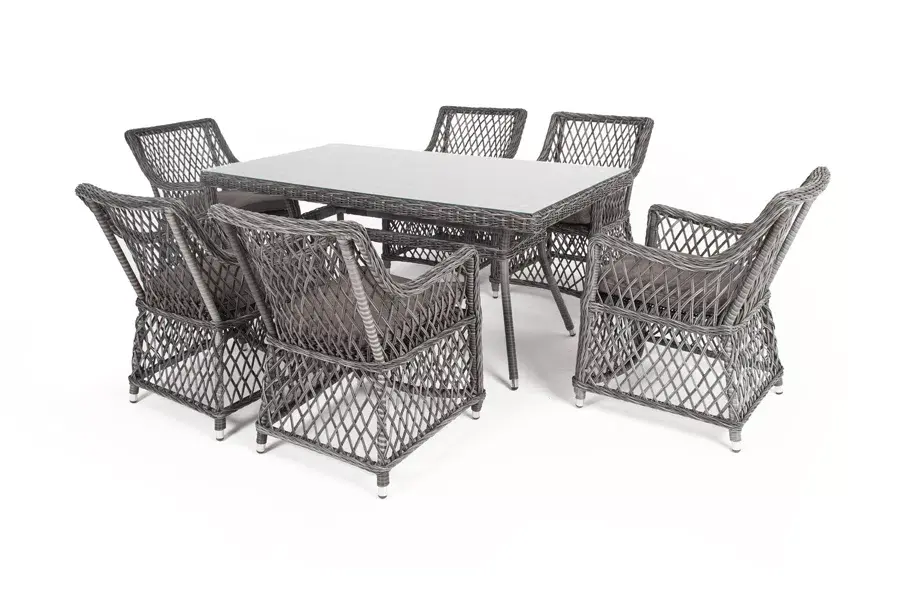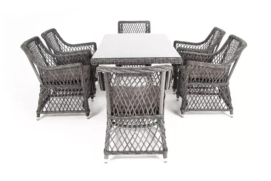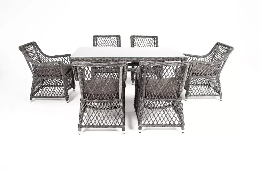 Состоит из прямоугольного стола со стеклянной столешницей, размером 1600×900×750 мм и 6 кресел, размером - 550×660×850 мм.