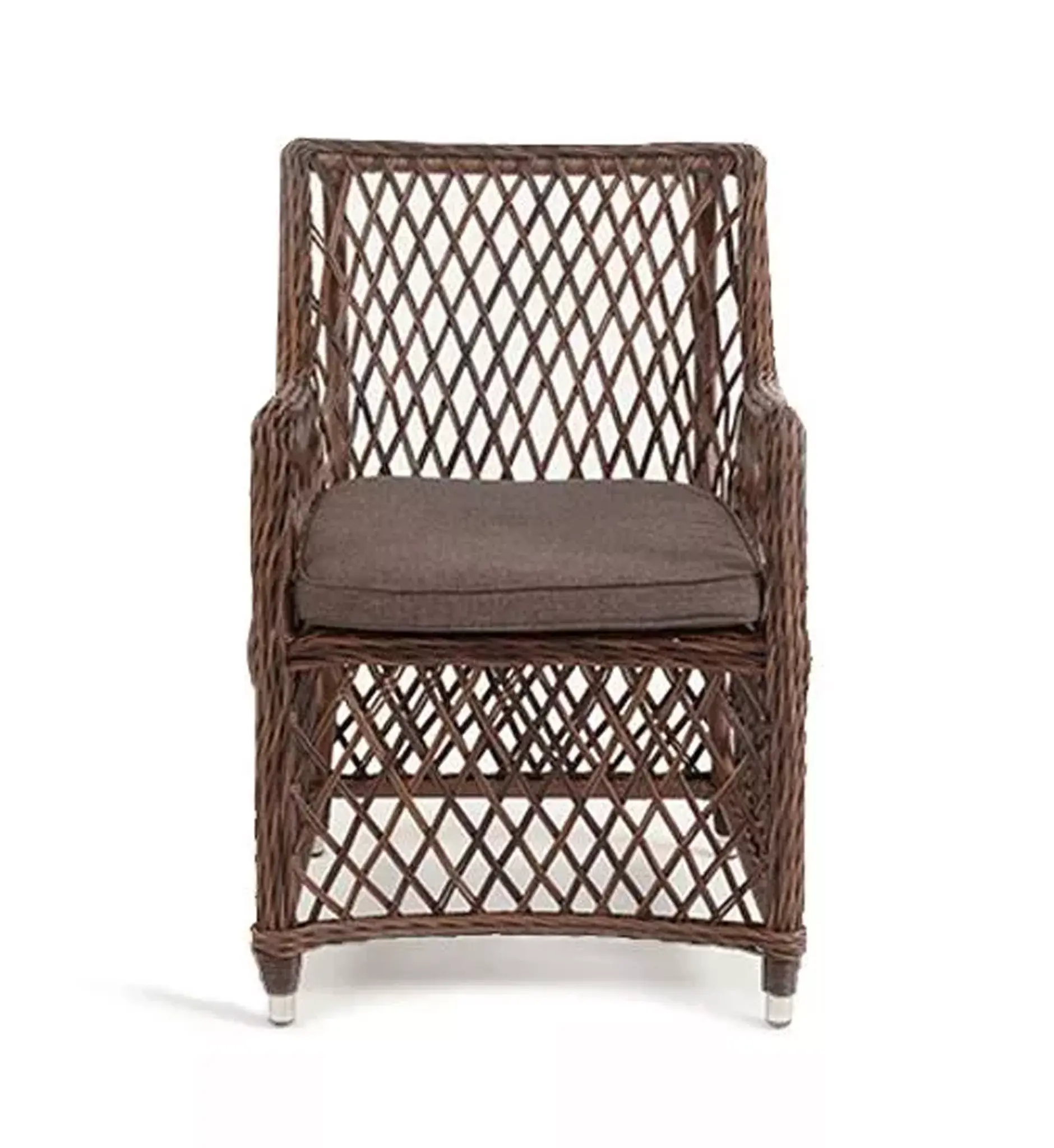 Каркас сделан из прочного алюминия. Сверху конструкции - ручное плетение из круглого искусственного ротанга. Стул коричневого цвета.
