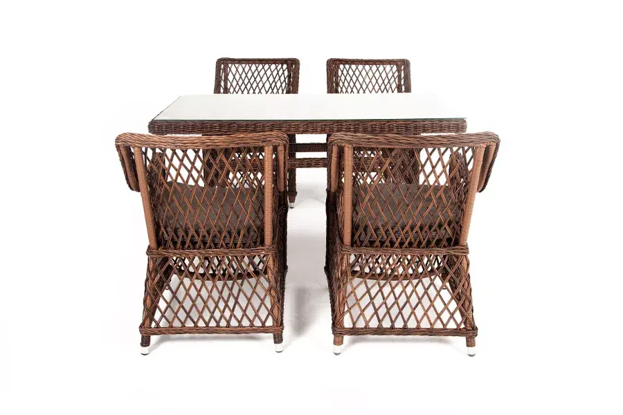 Каркас произведен из прочного алюминия, оплетка которого, выполнена вручную ротангом коричневого цвета. Поверхность защищает стеклянная столешница, толщиной 5 мм.