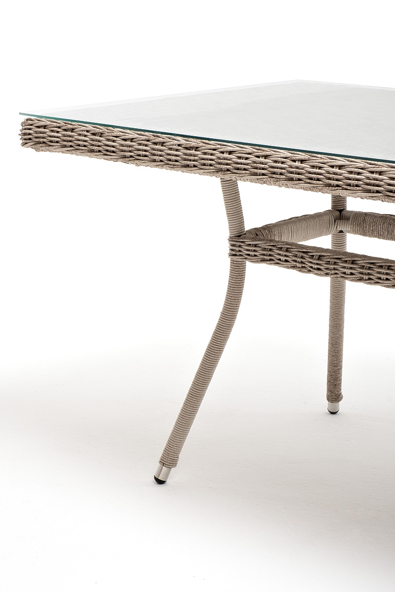 Каркас изделия изготовлен из алюминия, благодаря чему большой стол удобно перемещать. В качестве оплетки использован искусственный ротанг круглого ручного плетения в натуральном бежевом оттенке.