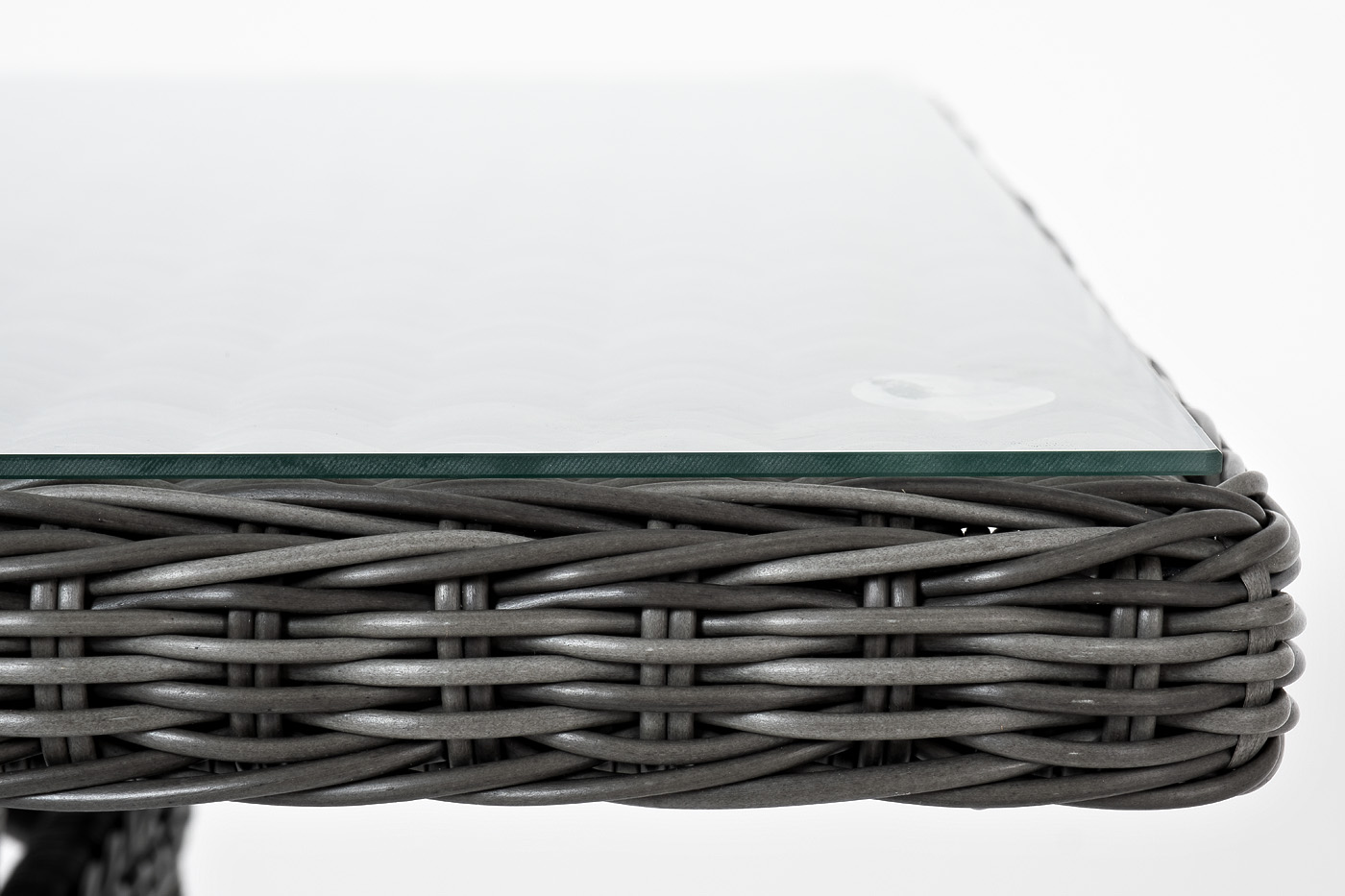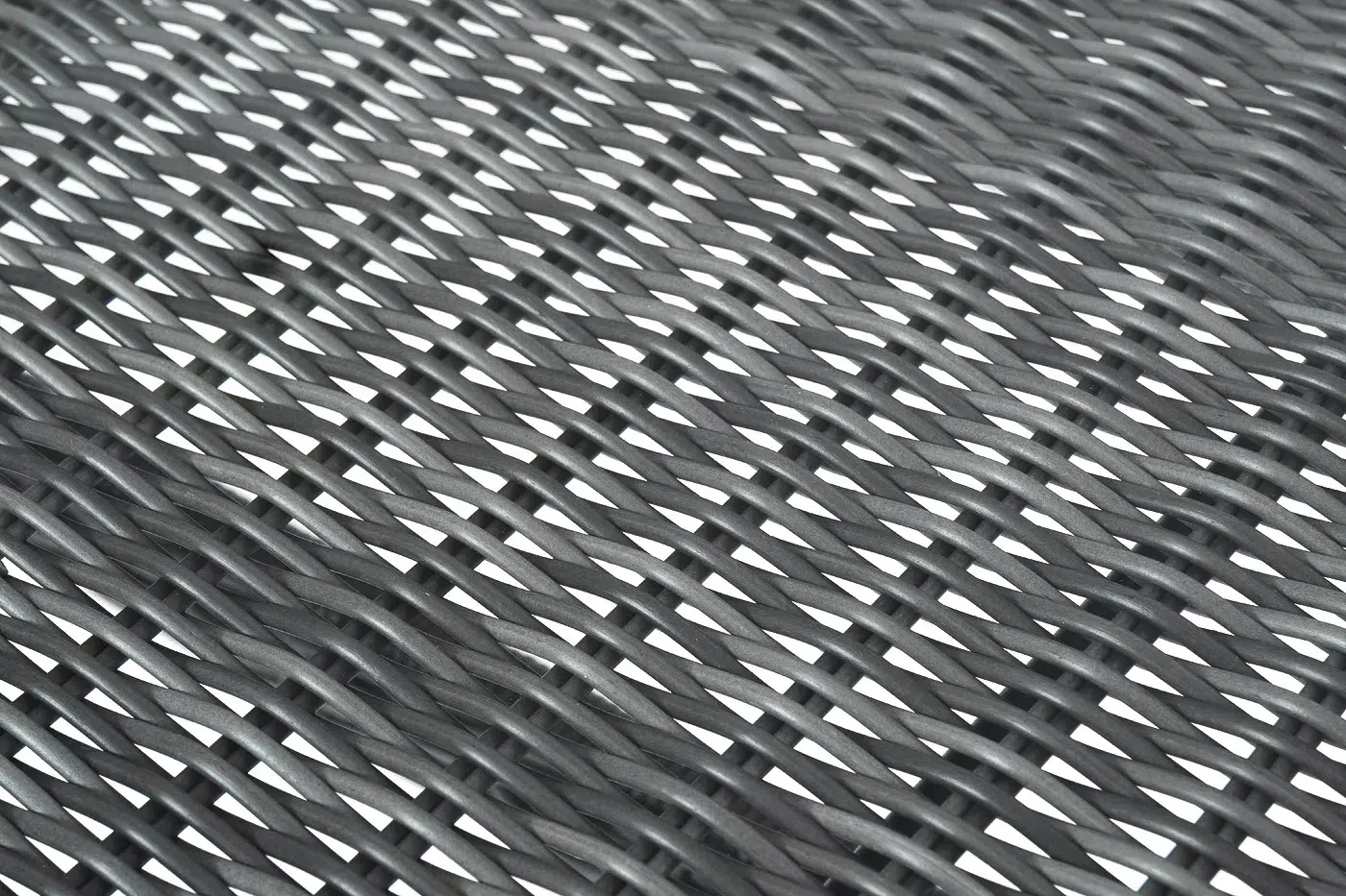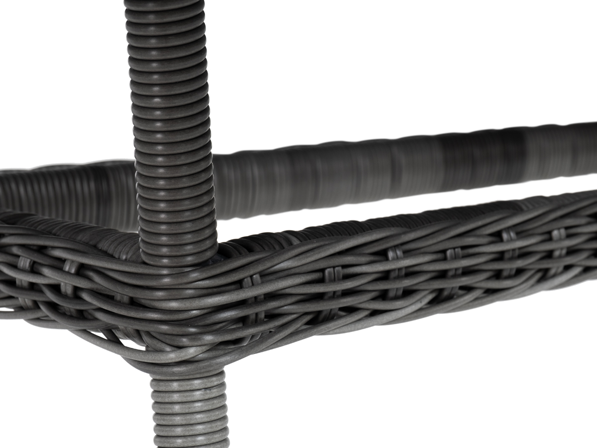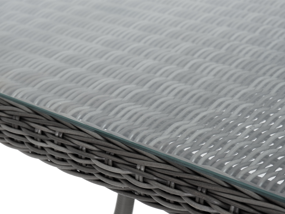 Каркас изделия изготовлен из прочного, но очень легкого алюминия, оплетенного вручную искусственным ротангом круглого плетения цвета "графит". Это долговечный материал, устойчивый к переменам погоды, атмосферным осадкам, прямым солнечным лучам. Благодаря ему стол можно использовать круглогодично под открытым небом.
