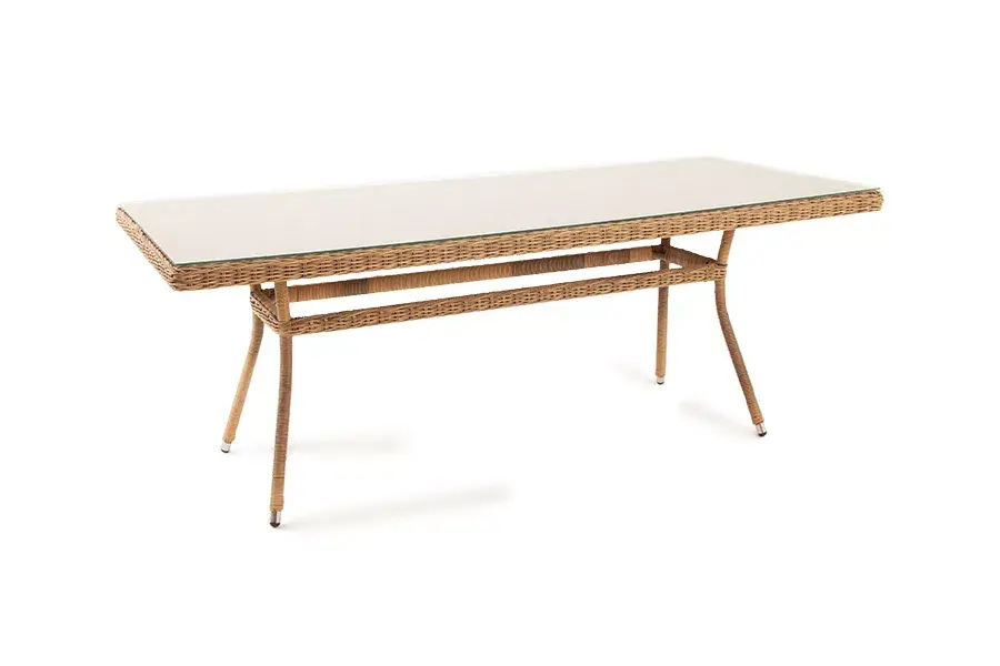 Размеры плетеного стола: 2000×900×750 мм. В нашем ассортименте также есть аналогичный стол меньших размеров.