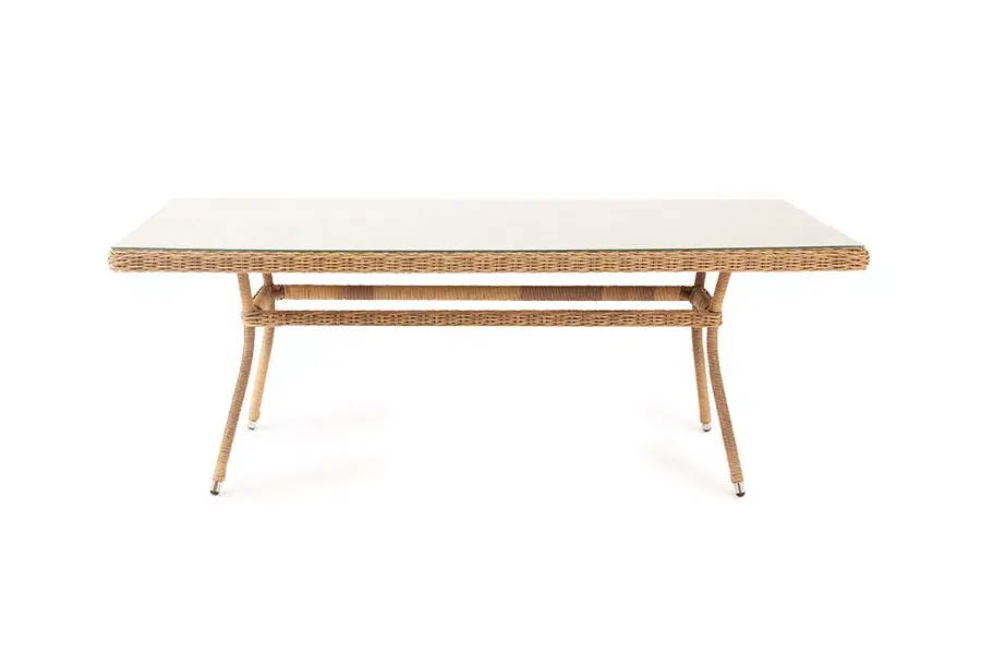 Каркас изделия изготовлен из алюминия, благодаря чему большой стол удобно перемещать. В качестве оплетки использован искусственный ротанг круглого ручного плетения в натуральном соломенном оттенке.