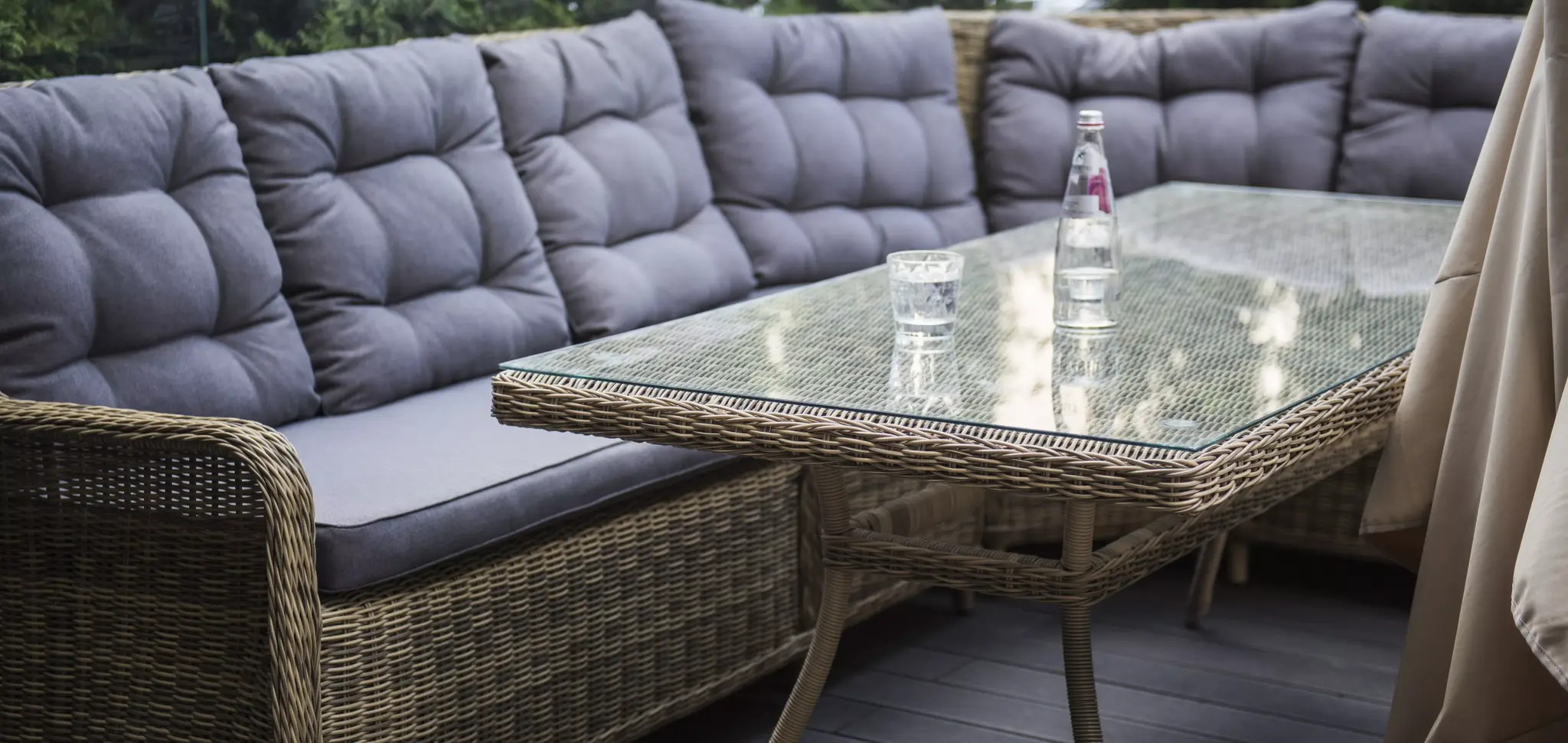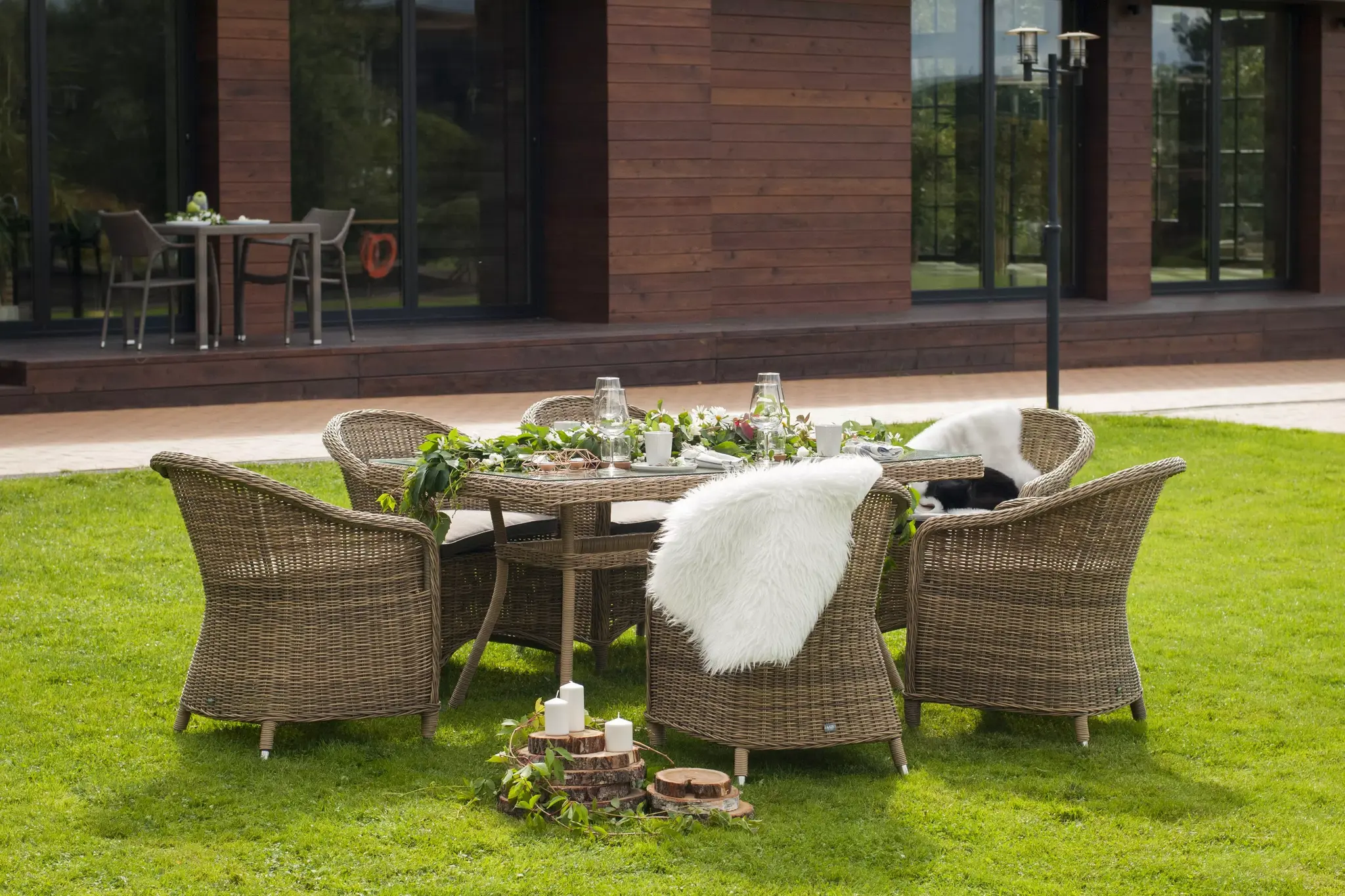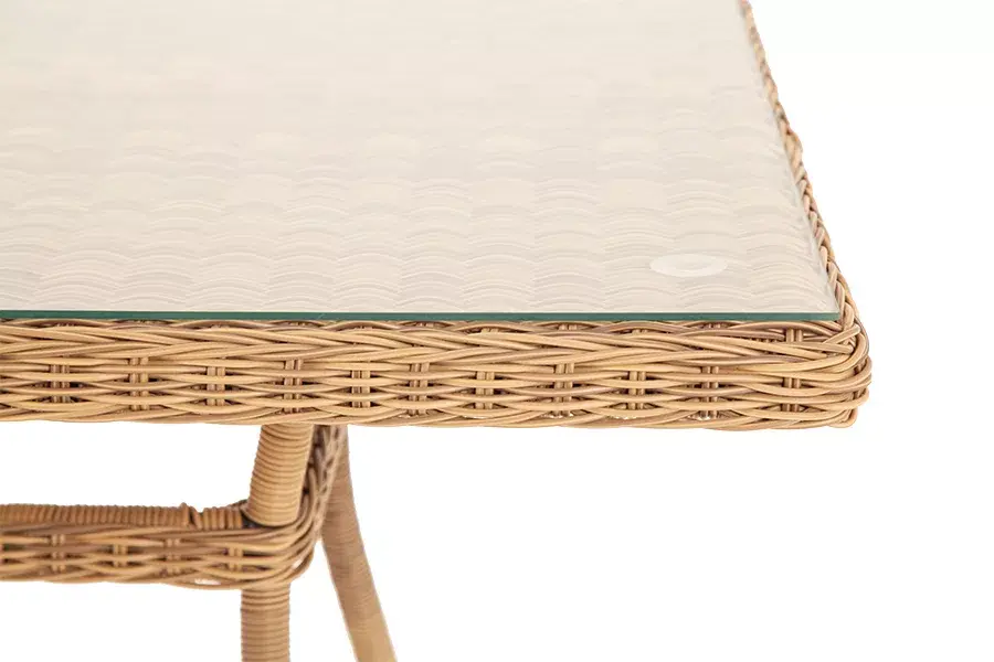 Материал устойчив к перепадам погоды, прямым солнечным лучам, атмосферным осадкам, легко моется. Столешница изготовлена из прочного стекла, толщиной 5 мм.