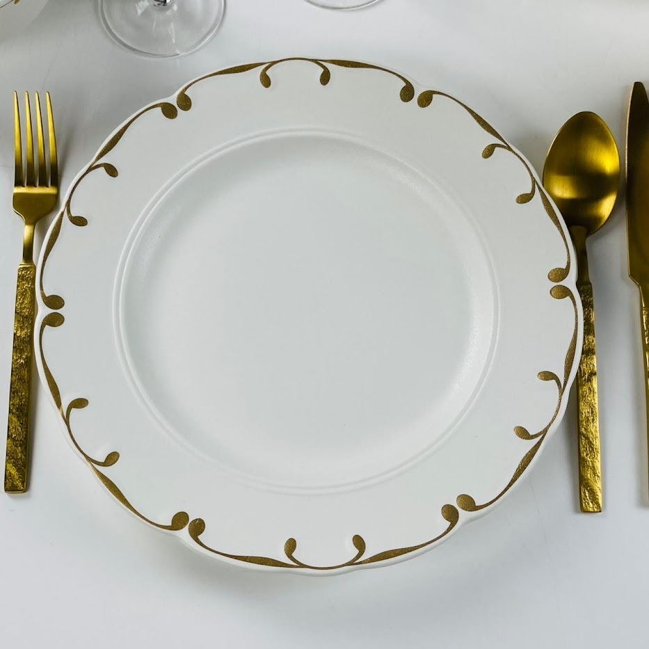 Посуда коллекции Александрия изготовлена из фарфора. Посуда с матовым эффектом, который достигается благодаря новой матовой глазури, которая распыляется на каждый предмет вручную. Край тарелки с золотой матовой обводкой, которая подчеркивает текстуру посуды. Несмотря на грубую текстуру поверхности посуды она не впитывает запахи, не окрашивается, легко моется. Коллекция состоит из: тарелки, салатники, блюда и другие предметы сервировки Материал: фарфор Не рекомендуем использовать в посудомоечной машине и микроволновой печи.