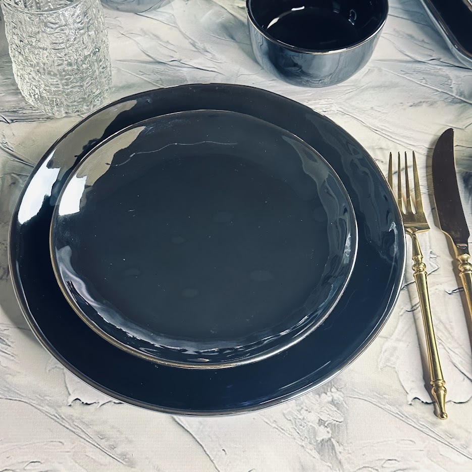Коллекция посуды из фарфора STORM представляет собой посуду для сервировки стола, c покрытием плотной темно синей глазурью с перламутром, края с отделкой золотом. Посуда переливается разными оттенками от черного до синего, в зависимости от освещения. Ассортимент: тарелки, салатники, блюда, сервизы и прочее. Материал: фарфор Не рекомендуется использовать в микроволновой печи и мыть в посудомоечной машине, по причине возможного повреждения золотого декоративного покрытия.