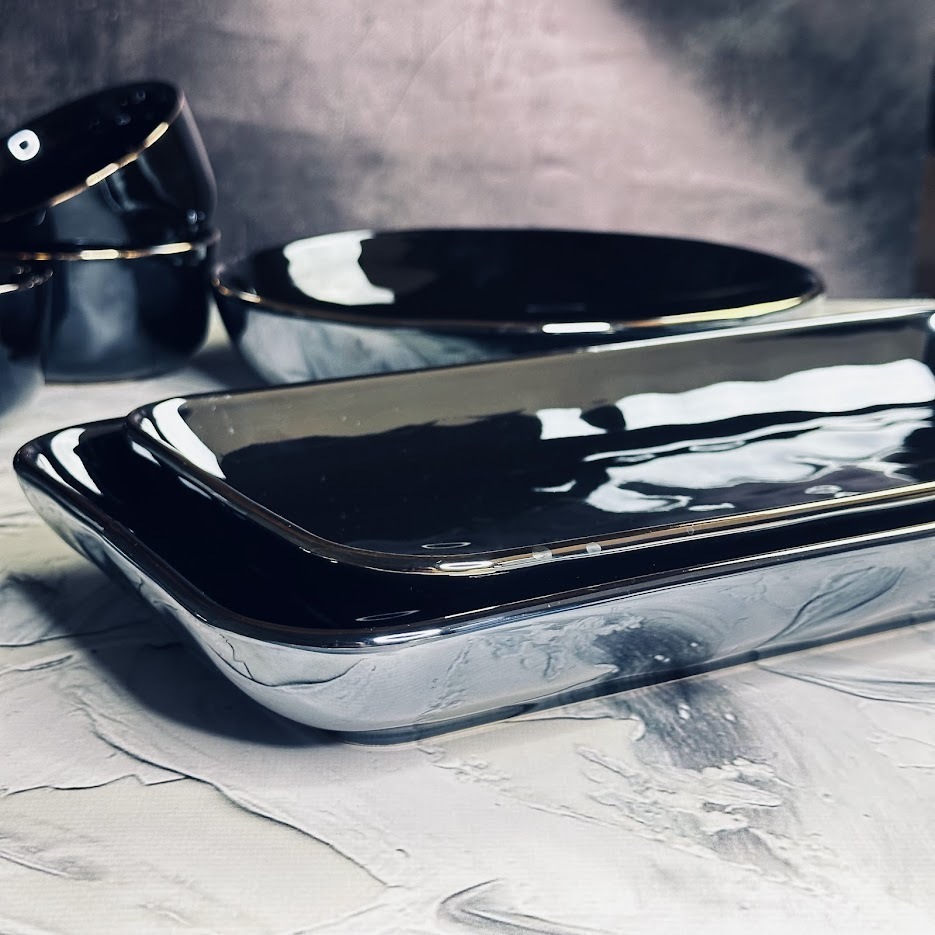 Коллекция посуды из фарфора STORM представляет собой посуду для сервировки стола, c покрытием плотной темно синей глазурью с перламутром, края с отделкой золотом. Посуда переливается разными оттенками от черного до синего, в зависимости от освещения. Ассортимент: тарелки, салатники, блюда, сервизы и прочее.