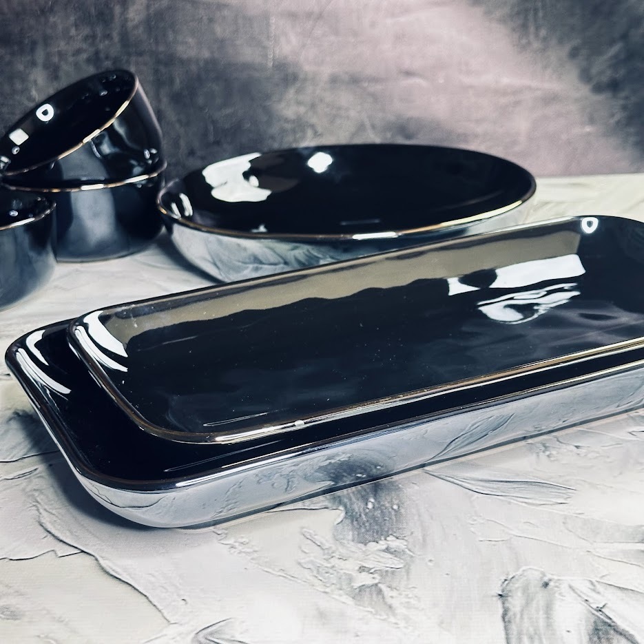 Коллекция посуды из фарфора STORM представляет собой посуду для сервировки стола, c покрытием плотной темно синей глазурью с перламутром, края с отделкой золотом. Посуда переливается разными оттенками от черного до синего, в зависимости от освещения. Ассортимент: тарелки, салатники, блюда, сервизы и прочее. Материал: фарфор Не рекомендуется использовать в микроволновой печи и мыть в посудомоечной машине, по причине возможного повреждения золотого декоративного покрытия.