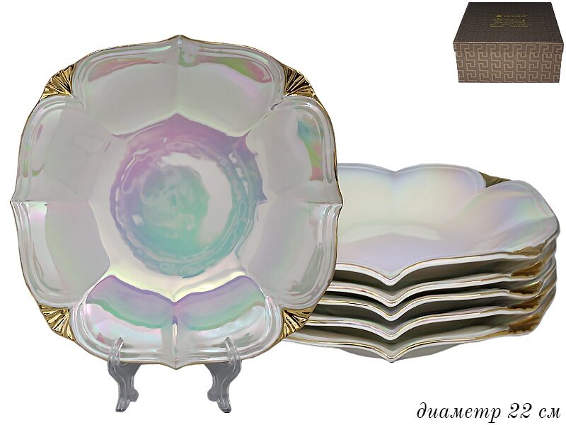 Изысканная коллекция посуды из фарфора, с перламутровым напылением и золотыми веерными вставками. Перламутровый люстр двух цветов: белый с легким серебрянным свечением и цветной с радужеыми переливами. Коллекция прекрасно смотрится на столе, золото и перламутр играют даже при небольшом освещении помещения. С состав входят: тарелки, салатники, блюда, менажницы, наборы для специй и сервировки. Каждый предмет упакован в стильную высококачественную коробку.