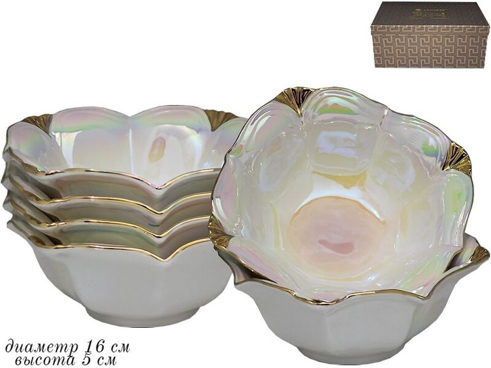 Изысканная коллекция посуды из фарфора, с перламутровым напылением и золотыми веерными вставками. Перламутровый люстр двух цветов: белый с легким серебрянным свечением и цветной с радужеыми переливами. Коллекция прекрасно смотрится на столе, золото и перламутр играют даже при небольшом освещении помещения. С состав входят: тарелки, салатники, блюда, менажницы, наборы для специй и сервировки. Каждый предмет упакован в стильную высококачественную коробку.
