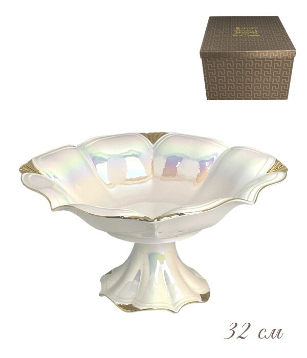 Изысканная коллекция посуды из фарфора, с перламутровым напылением и золотыми веерными вставками. Перламутровый люстр двух цветов: белый с легким серебрянным свечением и цветной с радужеыми переливами. Коллекция прекрасно смотрится на столе, золото и перламутр играют даже при небольшом освещении помещения. С состав входят: тарелки, салатники, блюда, менажницы, наборы для специй и сервировки. Каждый предмет упакован в стильную высококачественную коробку.
