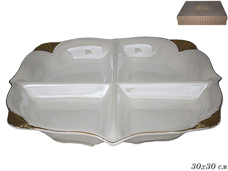 Изысканная коллекция посуды из фарфора, с перламутровым напылением и золотыми веерными вставками. Перламутровый люстр двух цветов: белый с легким серебрянным свечением и цветной с радужеыми переливами. Коллекция прекрасно смотрится на столе, золото и перламутр играют даже при небольшом освещении помещения. С состав входят: тарелки, салатники, блюда, менажницы, наборы для специй и сервировки. Каждый предмет упакован в стильную высококачественную коробку.