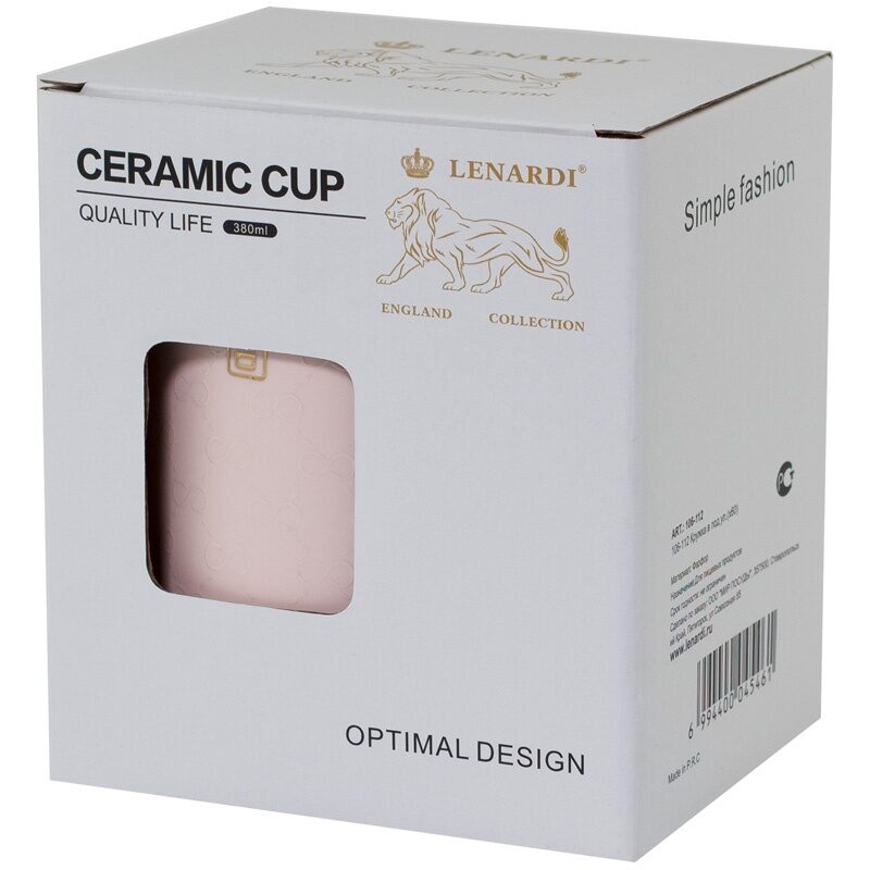 Кружка из фарфора, пудрового цвета, в комплекте с крышкой и ложкой. Матовая эмаль снаружи, с легким узором в виде бантиков, внутри белая. Золотой кант по краю кружки.