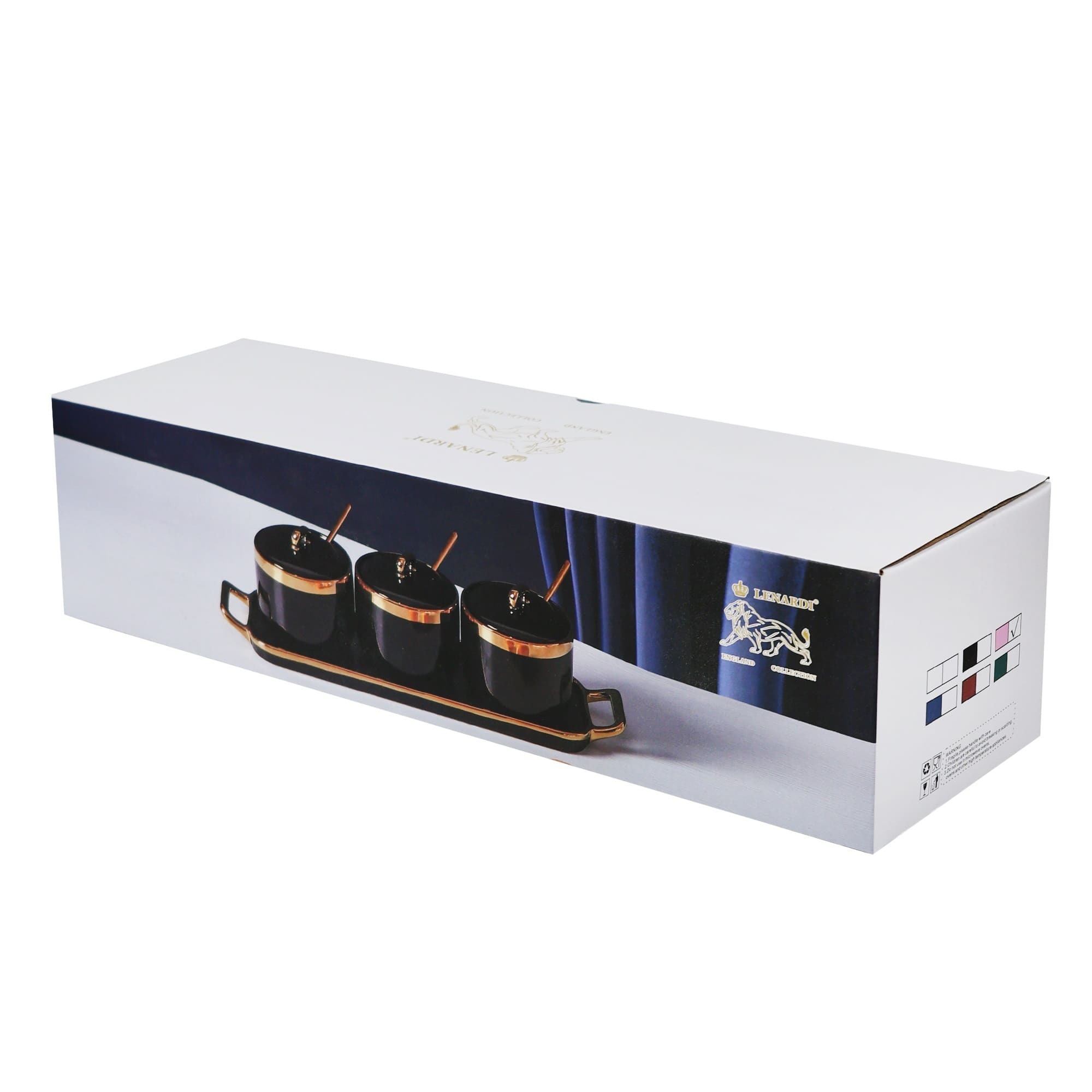 Набор баночек для хранения специй, сахара, кофе изготовлен из фарфора, размер каждой баночки 260 мл, к каждой баночке в наборе идет золотая ложечка. Баночки размещаются на подставке-подносе с ручками из фарфора с золотым краем. Баночки выполнены в моноцветах с золотой отводкой