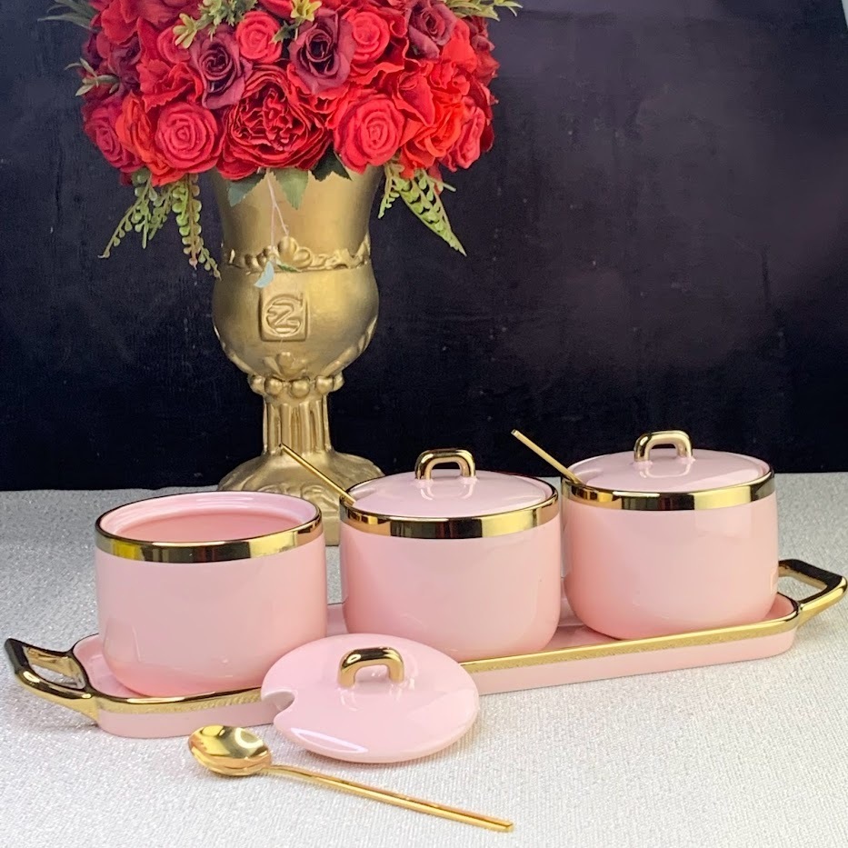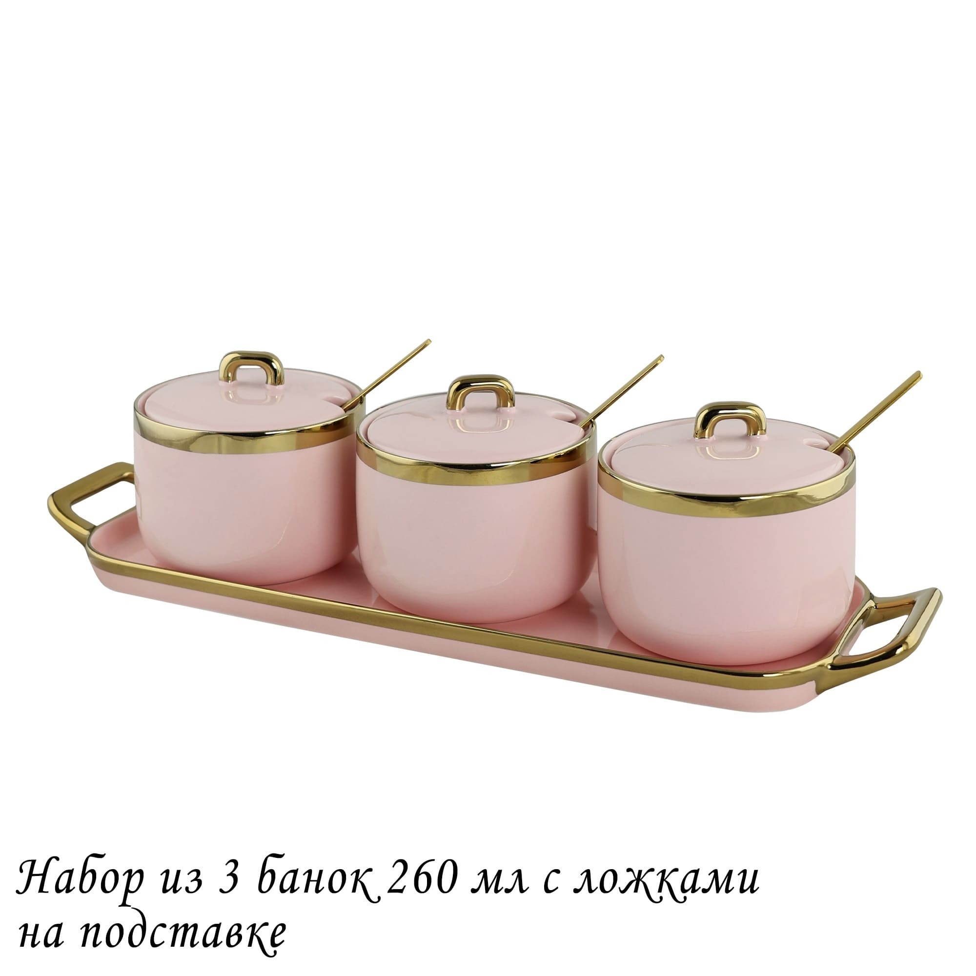 Набор баночек для хранения специй, сахара, кофе изготовлен из фарфора, размер каждой баночки 260 мл, к каждой баночке в наборе идет золотая ложечка. Баночки размещаются на подставке-подносе с ручками из фарфора с золотым краем. Баночки выполнены в моноцветах с золотой отводкой