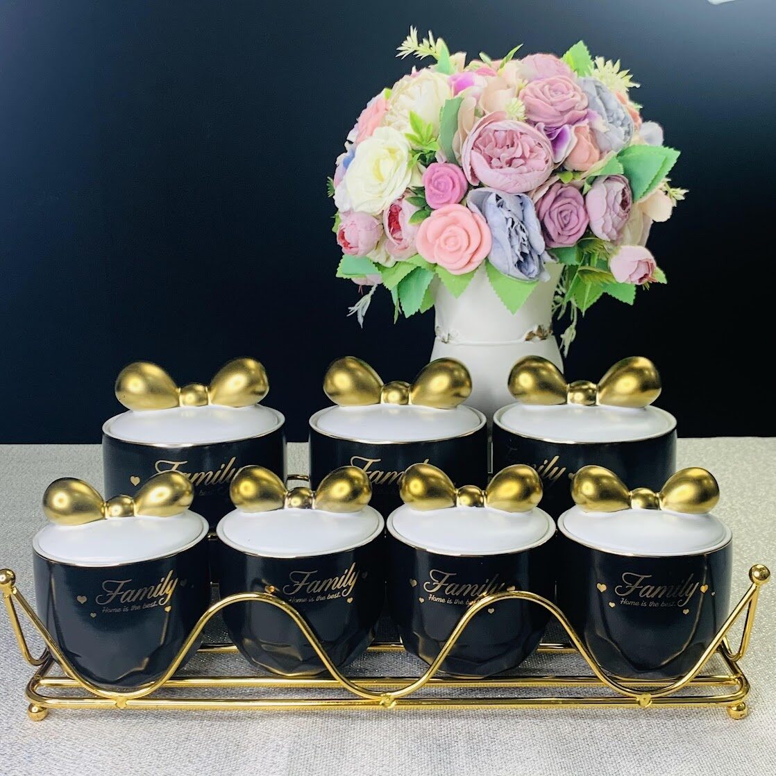 Набор из 7 баночек для хранения специй, сахара, кофе изготовлен из фарфора, размер 3х банок 500 мл, размер 4х баночек 260 мл. Баночки размещаются на металлической двухуровневой. Баночки выполнены в форме бочонков, крышки с золотыми бантиками, на крышке силиконовый уплотнитель