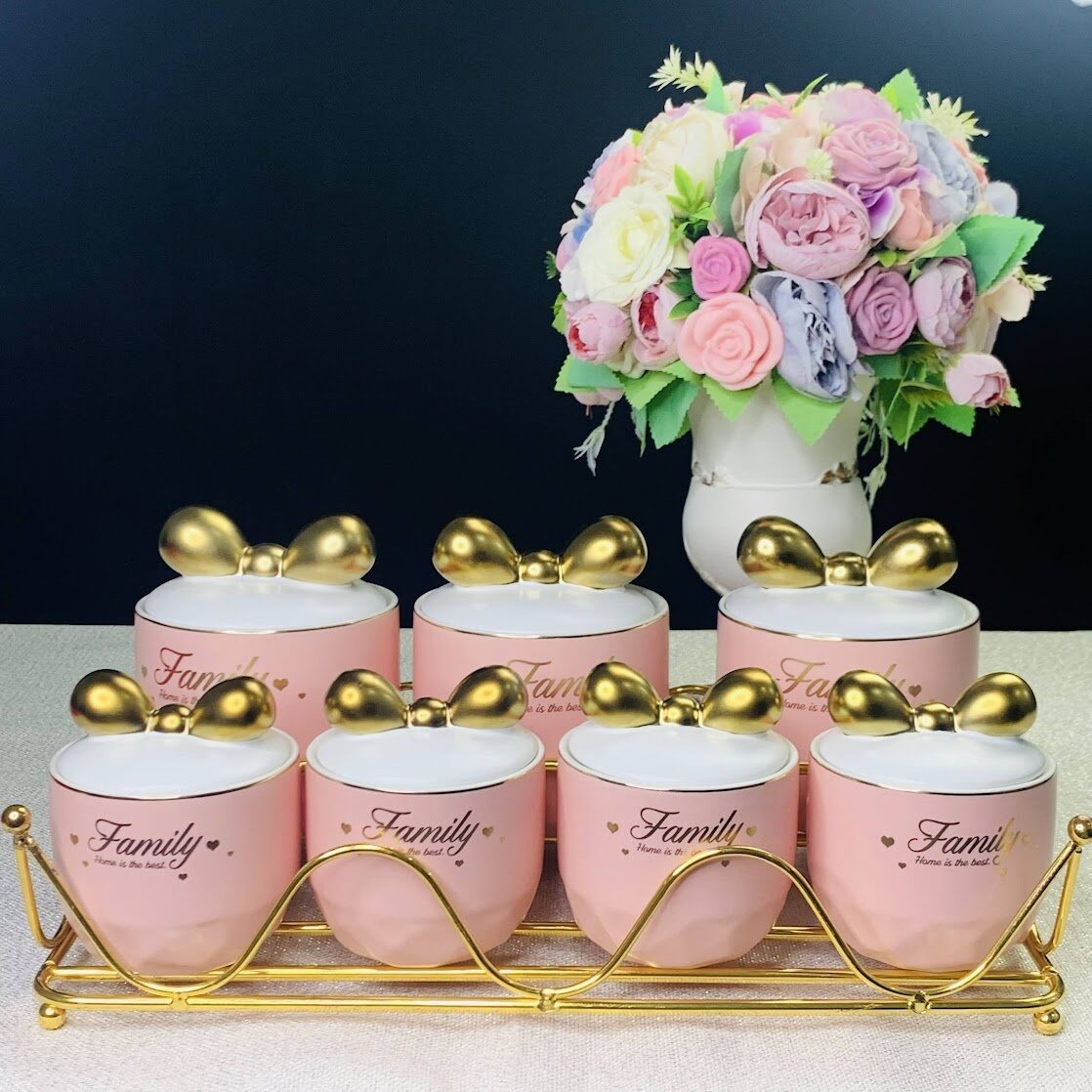 Набор из 7 баночек для хранения специй, сахара, кофе изготовлен из фарфора, размер 3х банок 500 мл, размер 4х баночек 260 мл. Баночки размещаются на металлической двухуровневой. Баночки выполнены в форме бочонков, крышки с золотыми бантиками, на крышке силиконовый уплотнитель Упаковано в подарочную коробку в цвет фарфора Материал: фарфор Не рекомендуется использовать в микроволновой печи и мыть в посудомоечной машине, по причине возможного повреждения золотого декоративного покрытия.