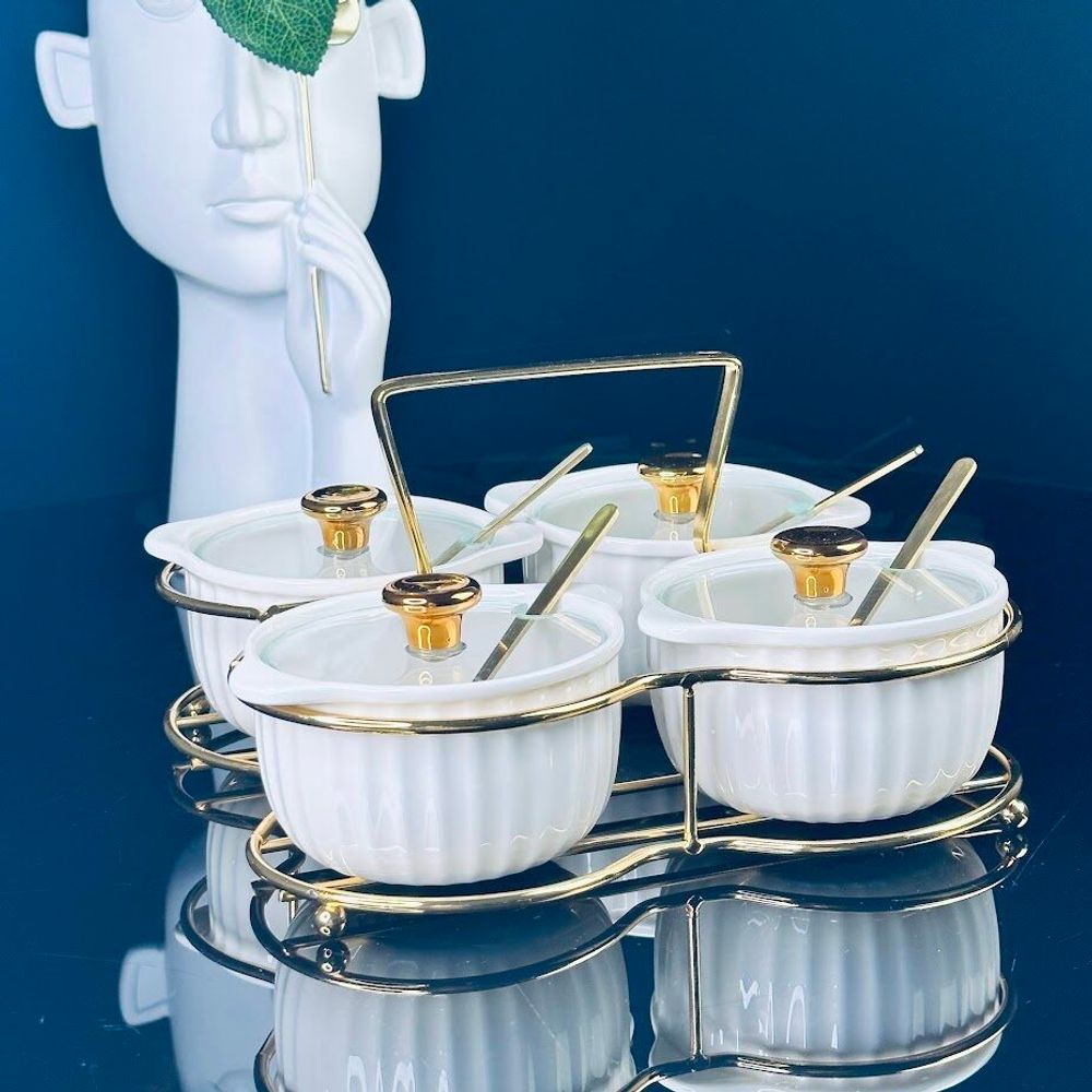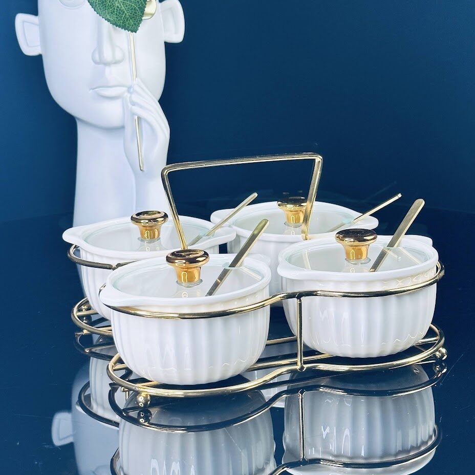 Набор 4х баночек для хранения специй, сахара, кофе изготовлен из фарфора, размер каждой баночки 150 мл, к каждой баночке в наборе идет ложечка. Баночки размещаются на металлической подставе. Баночки имеют рельефную форму и крышку из стекла Упаковано в подарочную коробку Материал: фарфор Не рекомендуется использовать в микроволновой печи и мыть в посудомоечной машине, по причине возможного повреждения золотого декоративного покрытия.