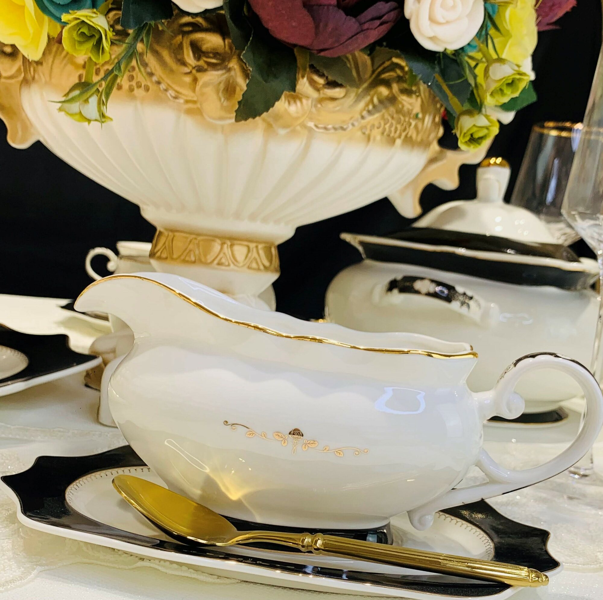 Коллекций RICH отличается строгим дизайном, необычной формой изделий, непренужденным и легким золотым декором. Сочетание белого фарфора, черной деколью на борту с золотом делает эту коллекцию универсальной для любого дизайна гостинной. Роскошь этой посуды сомодостаточна. Состав коллекции: столовые и чайные сервизы, отдельные предметы.