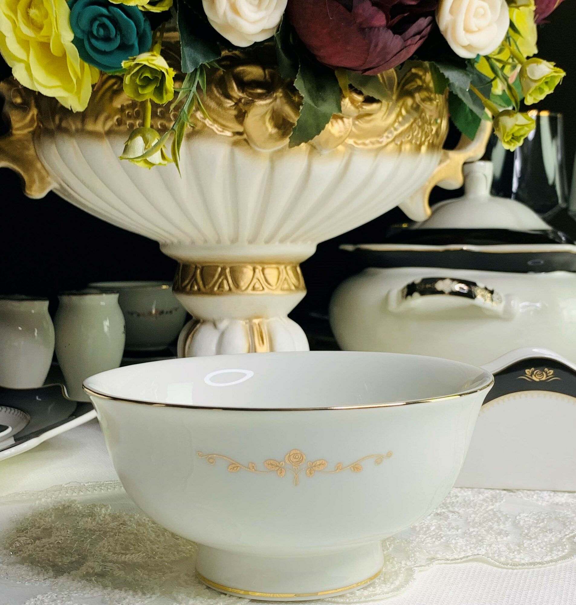 Коллекций RICH отличается строгим дизайном, необычной формой изделий, непренужденным и легким золотым декором. Сочетание белого фарфора, черной деколью на борту с золотом делает эту коллекцию универсальной для любого дизайна гостинной. Роскошь этой посуды сомодостаточна. Состав коллекции: столовые и чайные сервизы, отдельные предметы.