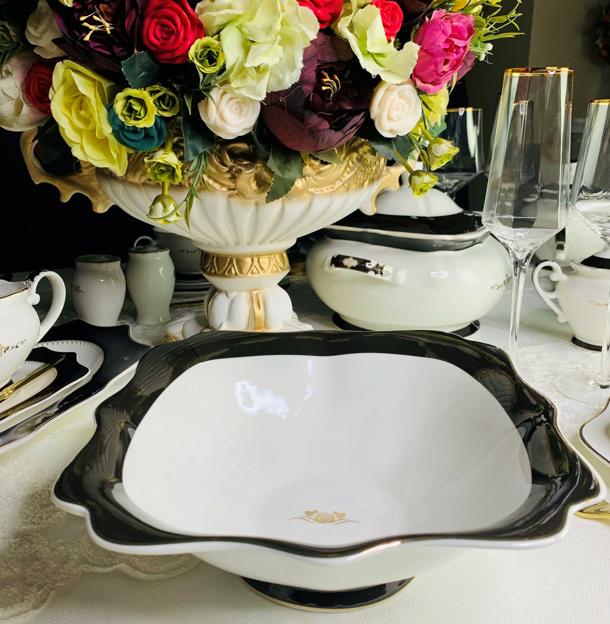 Коллекций RICH отличается строгим дизайном, необычной формой изделий, непренужденным и легким золотым декором. Сочетание белого фарфора, черной деколью на борту с золотом делает эту коллекцию универсальной для любого дизайна гостинной. Роскошь этой посуды сомодостаточна. Состав коллекции: столовые и чайные сервизы, отдельные предметы.