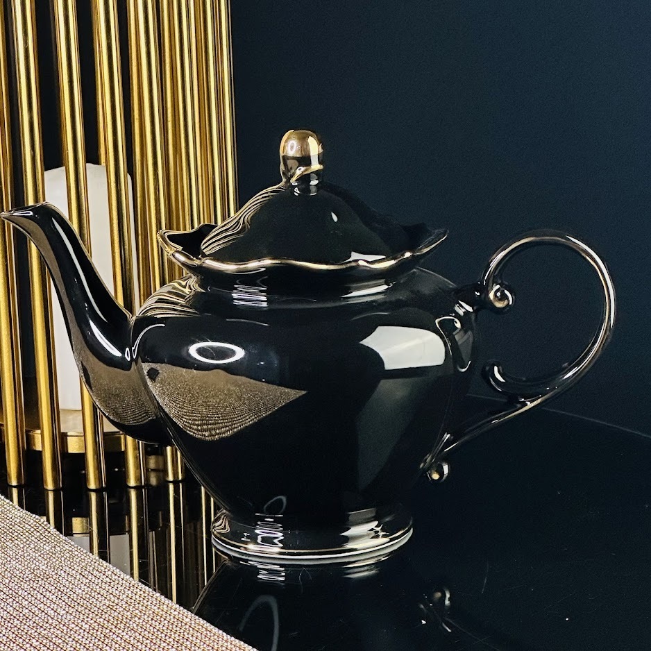 Изысканная чайная коллекция NOIR Выполнена из тонкостенного фарфора, покрытого эмалью голубого черного цвета. Золотая отделка и резные элементы придают коллекции утонченного шарма упаковано в подарочную коробку.