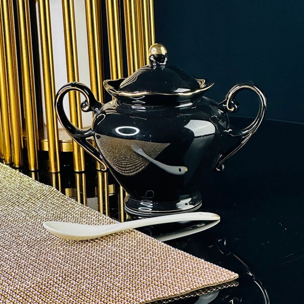 Изысканная чайная коллекция NOIR Выполнена из тонкостенного фарфора, покрытого эмалью голубого черного цвета. Золотая отделка и резные элементы придают коллекции утонченного шарма упаковано в подарочную коробку.