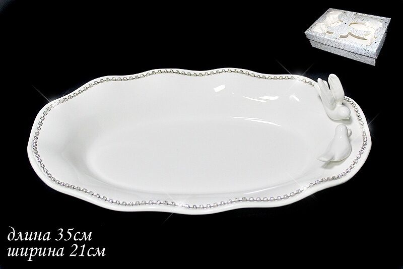 Коллекция ГОЛУБЬ И ГОЛУБКА изготовлена из облегченной керамики. Высококачественная белоснежная глянцевая глазурь добавляет долговечность и высокий эстетический вид. Борт посуды украшен лентой из страз и парой влюбленных голубей. Коллекция состоит из различных предметов сервировки