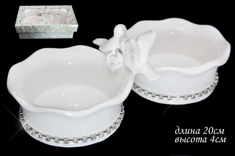 Коллекция ГОЛУБЬ И ГОЛУБКА изготовлена из облегченной керамики. Высококачественная белоснежная глянцевая глазурь добавляет долговечность и высокий эстетический вид. Борт посуды украшен лентой из страз и парой влюбленных голубей. Коллекция состоит из различных предметов сервировки
