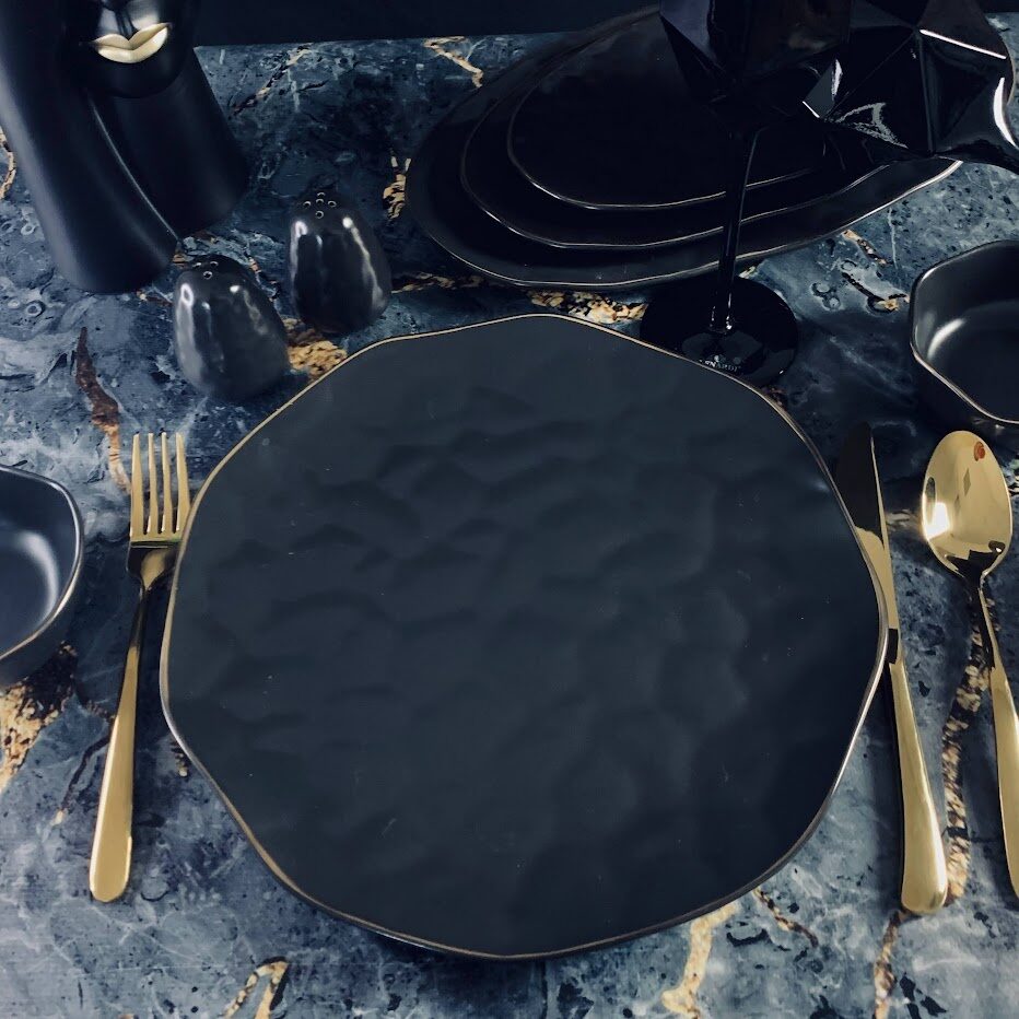 Коллекция МАРОККО выполнена из фарфора, покрытого черной матовой эмалью с неровной и объемной поверхностью, золотым тонким ободком. Плоские формы тарелок идеально подходят для сервировки в азиатском стиле, современных сервировках. Посуда прекрасно подходит как для ресторанов, так и для домашнего использования. Материал: фарфор Не рекомендуется использовать в микроволновой печи и мыть в посудомоечной машине, по причине возможного повреждения золотого декоративного покрытия.