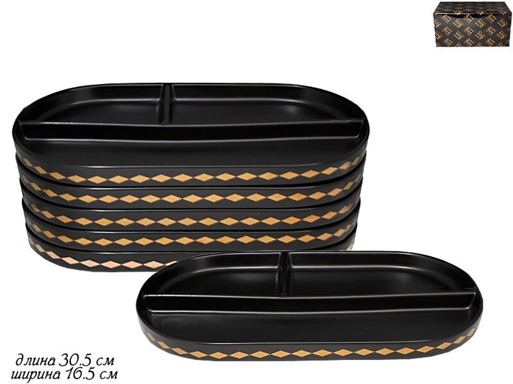 Она представлена в черном и белом варианте. Черная – выполнена из фарфора и покрыта матовой эмалью, белая – глянцевой эмалью. Декорированы стильным дизайном в виде золотых треугольников, обрамляющих предметы.