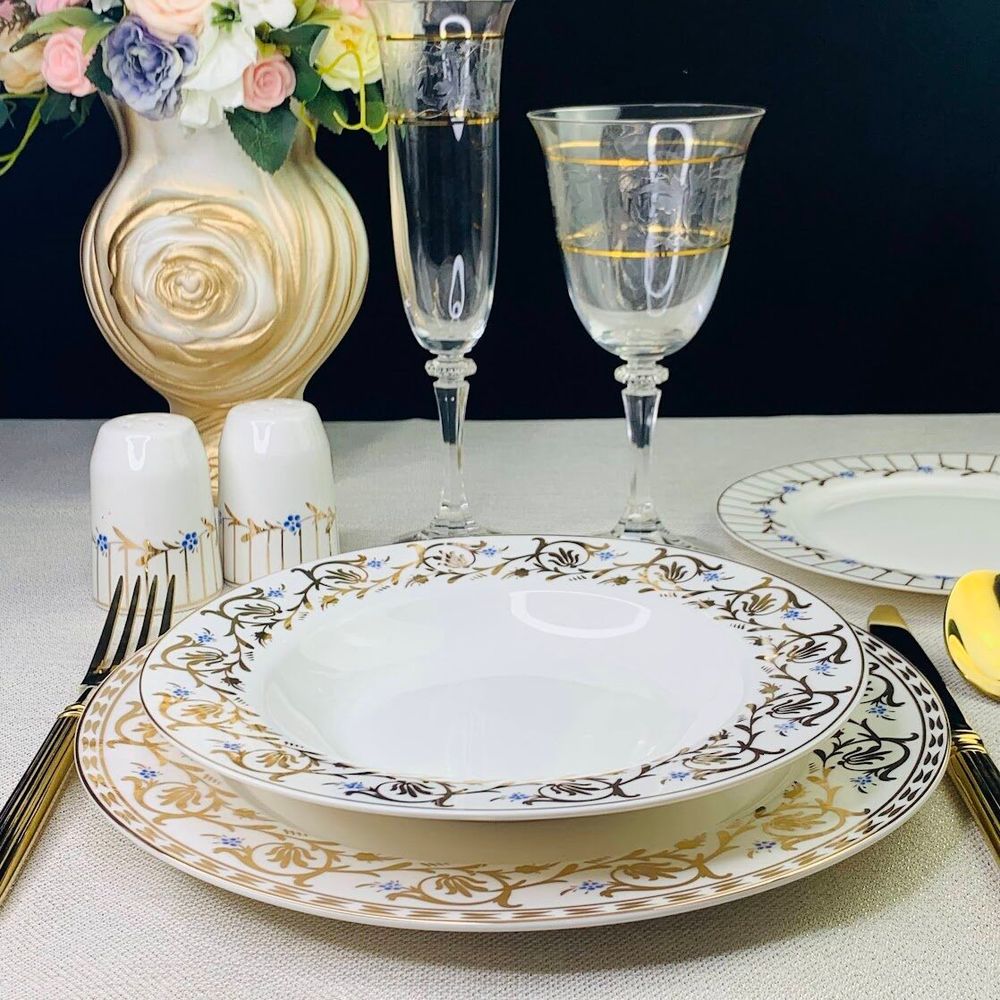 Столовые сервизы 20 предметов из фарфора с золотым декором. К сервизам можно приобрести чайный сервиз или набор, а так же кофейный набор.