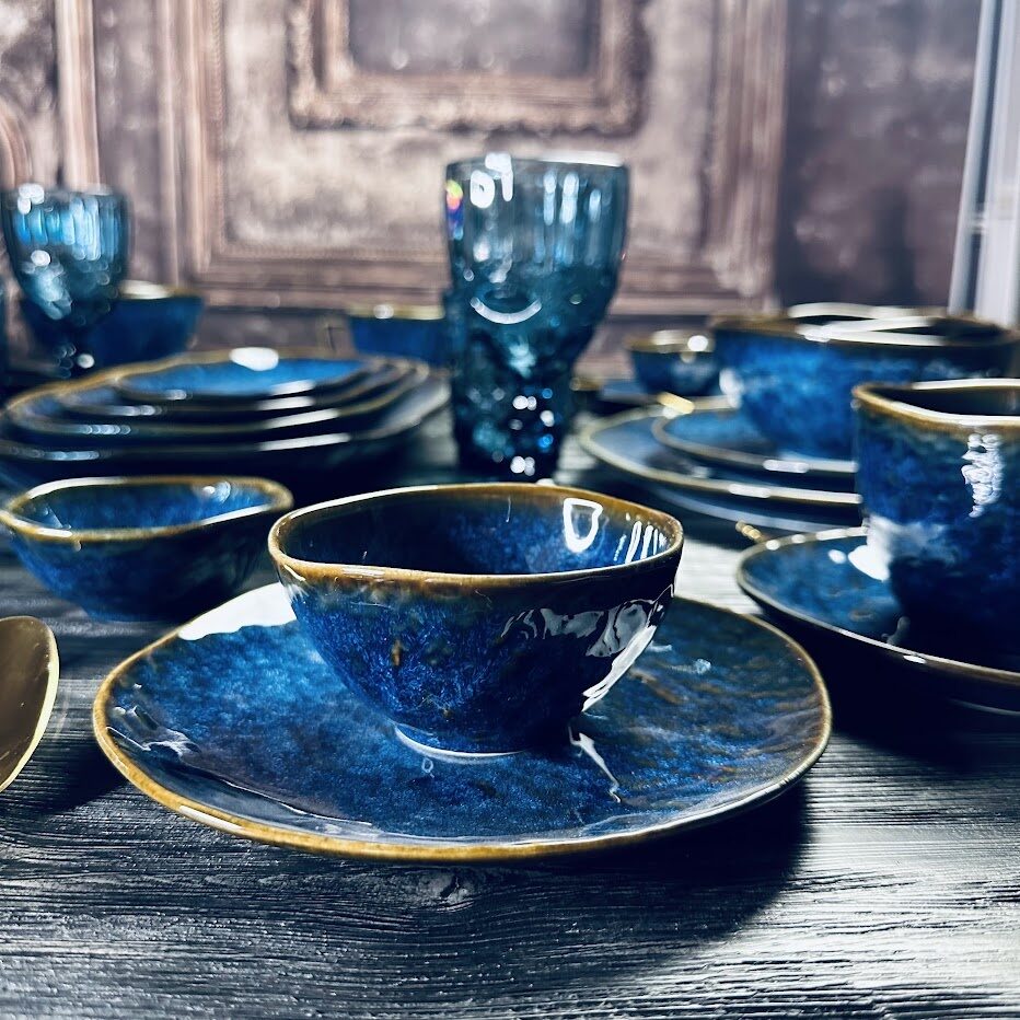 Коллекция AQUAMARINE изготовлена их фарфора, покрыта глянцевой цветной глазурью глубокого синего цвета с вкраплениями. Структура поверхности изделий имеет рельеф. Благодаря прочной и глянцевой глазури посуду легко мыть. Подходит для дома и для ресторанов.