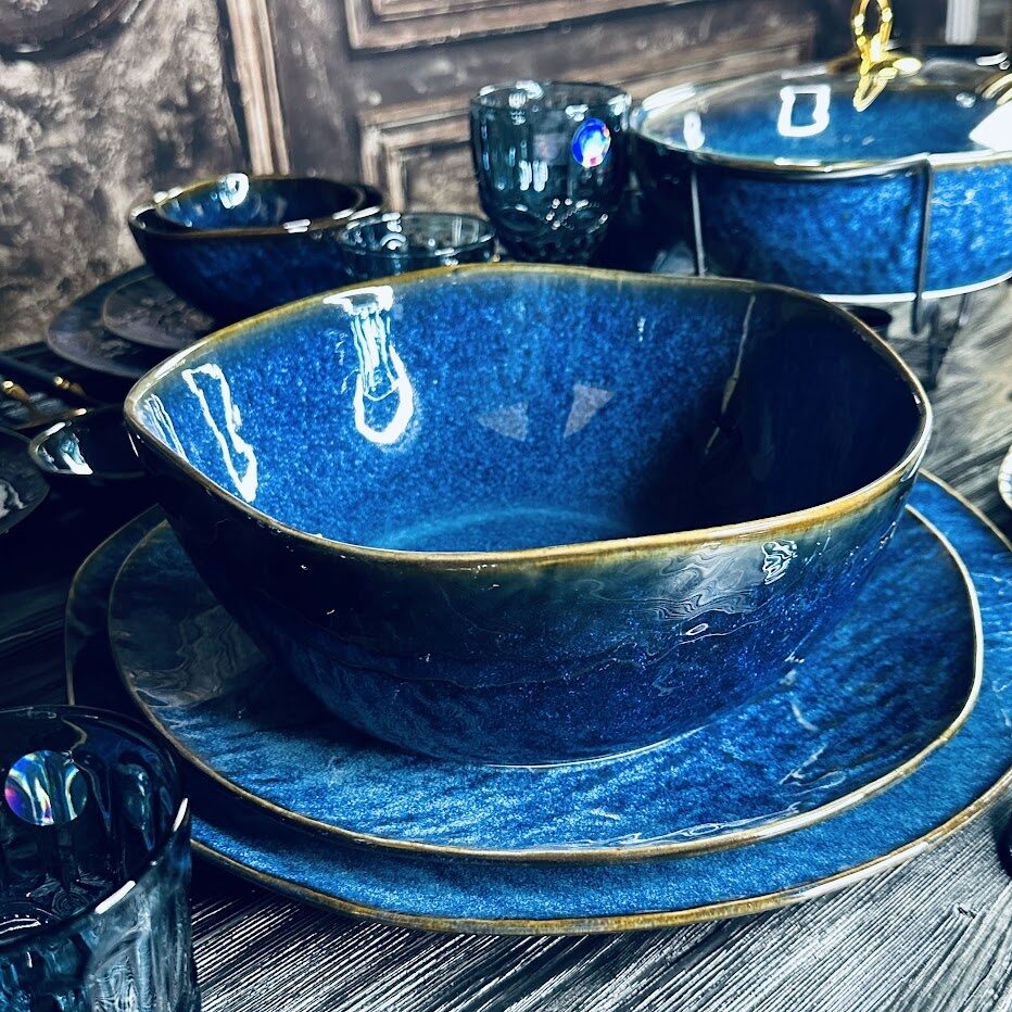 Коллекция AQUAMARINE изготовлена их фарфора, покрыта глянцевой цветной глазурью глубокого синего цвета с вкраплениями. Структура поверхности изделий имеет рельеф. Благодаря прочной и глянцевой глазури посуду легко мыть. Подходит для дома и для ресторанов.