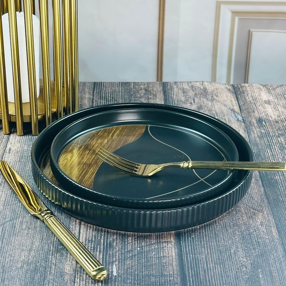 Коллекция посуды из фарфора WOOD выполнена с использованием цветной глазури, декор золото с вставками с имитацией дерева Материал: костяной фарфор Не рекомендуется использовать в микроволновой печи и мыть в посудомоечной машине, по причине возможного повреждения золотого декоративного покрытия.